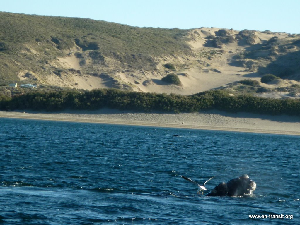 Les yeux encore gonflés de sommeil, nous profitons du lever de soleil face à la baie. Aujourd'hui, nous allons enfin voir les baleines! On est tout excités. Nous partons à 7h30 avec une classe de collégiens à bord d'un gros zodiac. C'est très instructif et les mômes se tiennent à carreau. Bon, là on est vraiment près, moins de 20m, de ces colosses marins atteignant la taille d'un bus de tourisme! Les mamans pèsent 10 tonnes et en perdent 1 en mettant leur petit au monde (1 tous les 3 ans). Les baleines franca-australes sont en voie de disparition et donc protégées. Plusieurs mâles se partagent la même femelle sans se battre : la seule compétition est spermatique. Ce sont des mammifères, et sortent donc la tête de l'eau toutes les 3 min environ pour respirer. Les mouettes profitent de ce moment pour picorer les crustacés attachés à leur tête. Mais depuis quelques années, elle percent la peau de la baleine pour se nourrir de leur graisse.