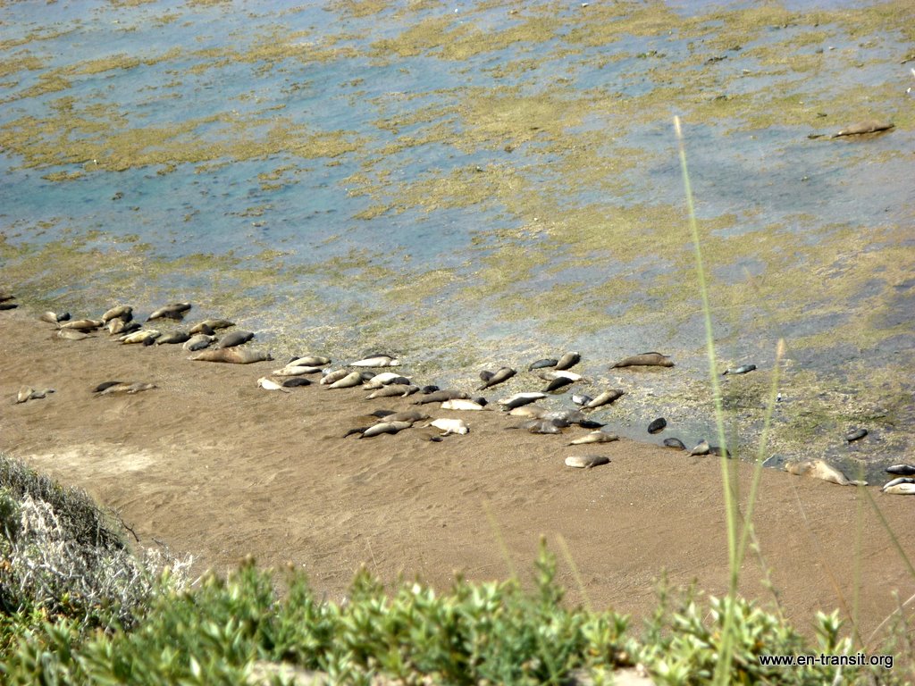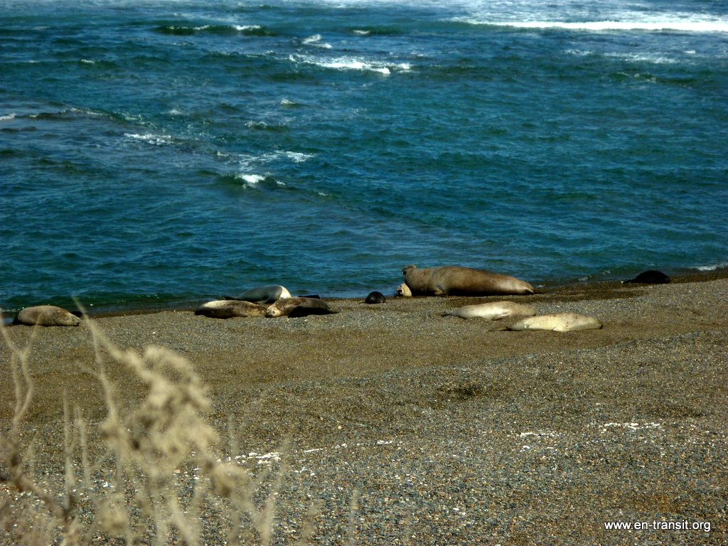 Après ce petit cours illustré nous allons lézarder en terrasse avec un café en attendant nos 2 acolytes qui pointent leur nez vers 11h. Et hop c'est parti pour un petit tour de la péninsule où nous allons voir plusieurs spots d'éléphants de mer. Le premier est un poil décevant car très loin. Mais le suivant nous offre un chouette spectacle. Comme leurs homologues lions, les éléphants de mer sont peu actifs à cette période de l'année. Ils se reposent de leur migration, muent et se reproduisent. Nous assistons à une scène violente où un mâle dominant (pacha) va punir une de ces femelles... Nous ne saurons jamais pourquoi...