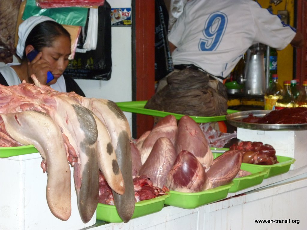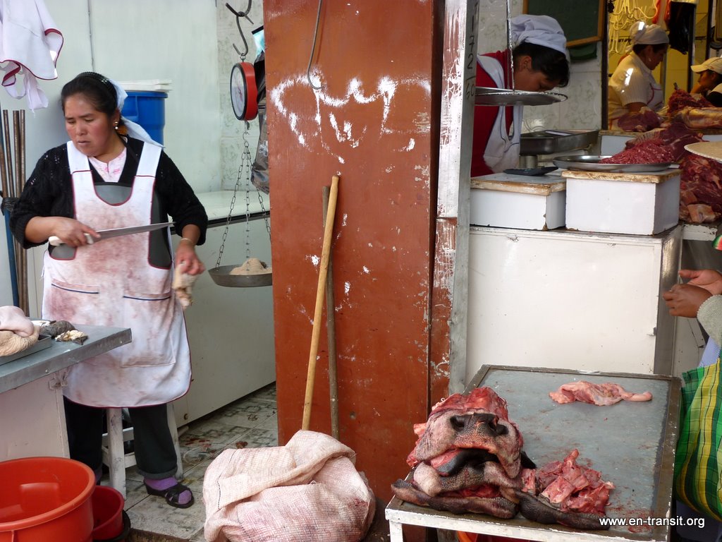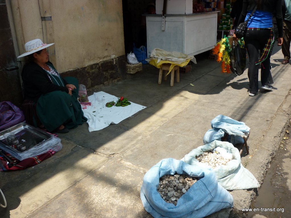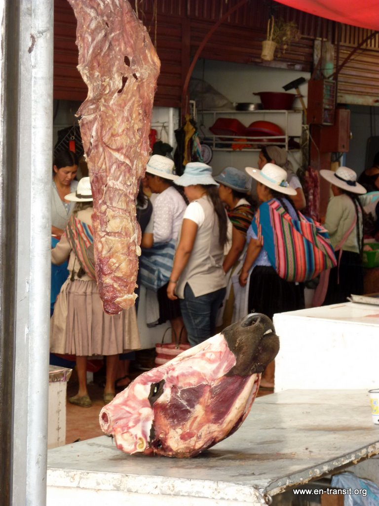 Pour faire les courses, il faut se rendre à la Cancha, immense marché du centre-ville. C'est un labyrinthe où l'on peut trouver de tout : des fruits, des légumes, du fromage, de la viande, toutes les abats qu'on puisse imaginer (langue, tripe, museau, œsophage, tête...) ; des fœtus de lama, des miniatures, de la fausse monnaie pour les rites à la Pachamama! Par contre, il faut vraiment se méfier : alors que je tenais ma petite sacoche à la main, une dame à réussi à me l'ouvrir pour essayer de me piquer des sous!