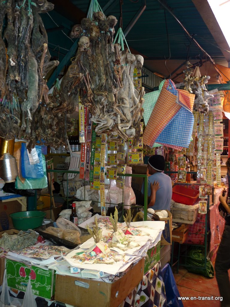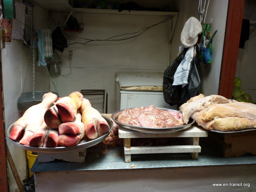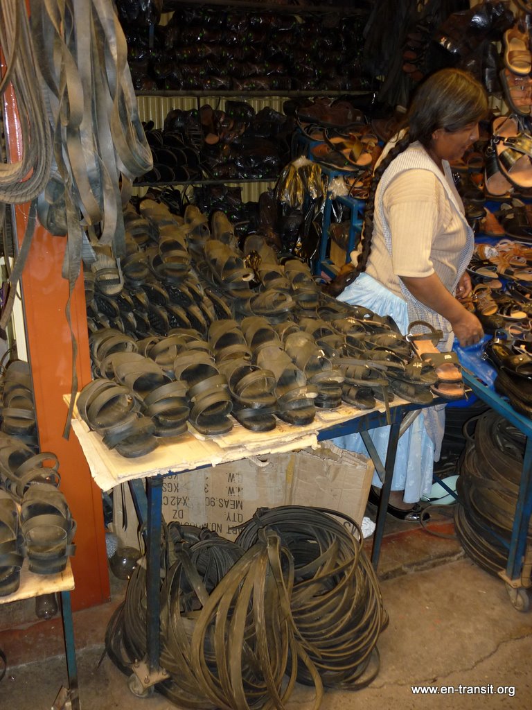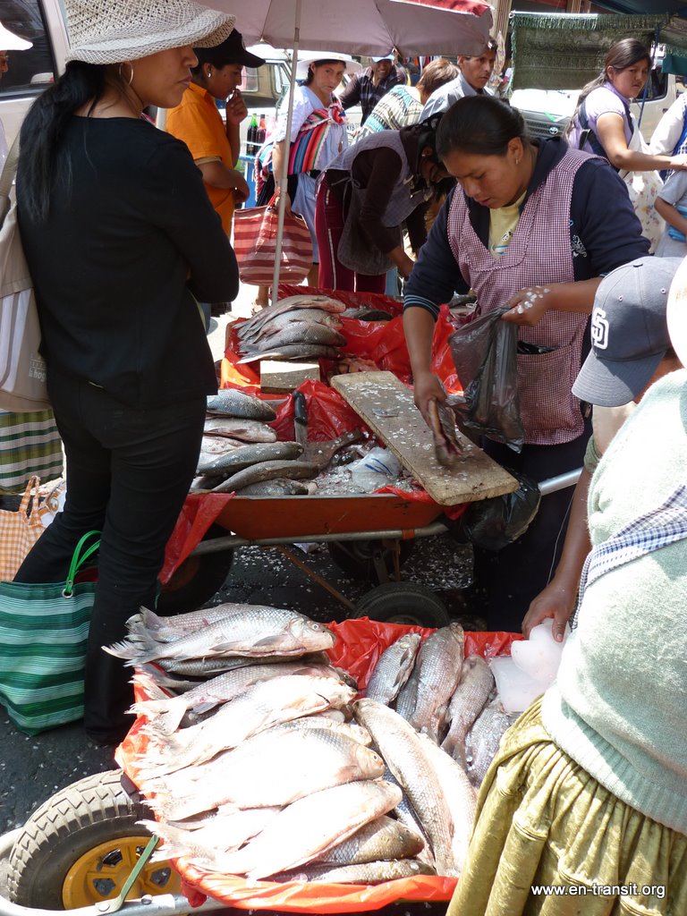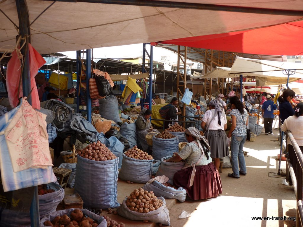 Pour faire les courses, il faut se rendre à la Cancha, immense marché du centre-ville. C'est un labyrinthe où l'on peut trouver de tout : des fruits, des légumes, du fromage, de la viande, toutes les abats qu'on puisse imaginer (langue, tripe, museau, œsophage, tête...) ; des fœtus de lama, des miniatures, de la fausse monnaie pour les rites à la Pachamama! Par contre, il faut vraiment se méfier : alors que je tenais ma petite sacoche à la main, une dame à réussi à me l'ouvrir pour essayer de me piquer des sous!