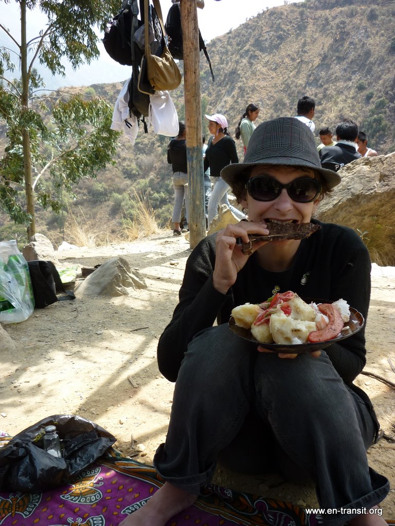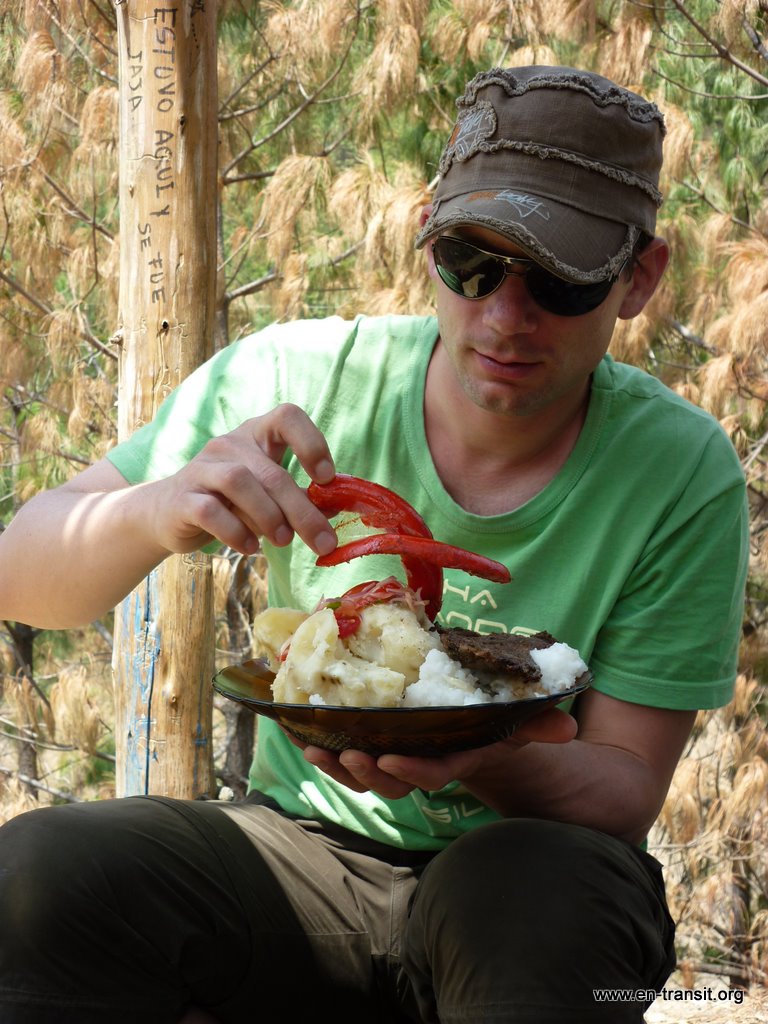 Nous avons également testé l'hospitalité bolivienne. Lors d'un pique-nique, alors que nous en étions au dessert, un jeune homme vient nous apporter une assiette remplie de victuailles : viande de boeuf, saucisses, riz gluant au fromage, pommes de terre, salade. Miguel nous explique alors que lorsqu'un bolivien offre une assiette de nourriture, il faut la lui rendre... vide. Nous voilà donc, chacun notre tour, mangeant du bout des lèvres ce plat gargantuesque. Finalement, nous avons feinté et avons emporté les restes dans un plat que nous avons donné aux chiens en rentrant!