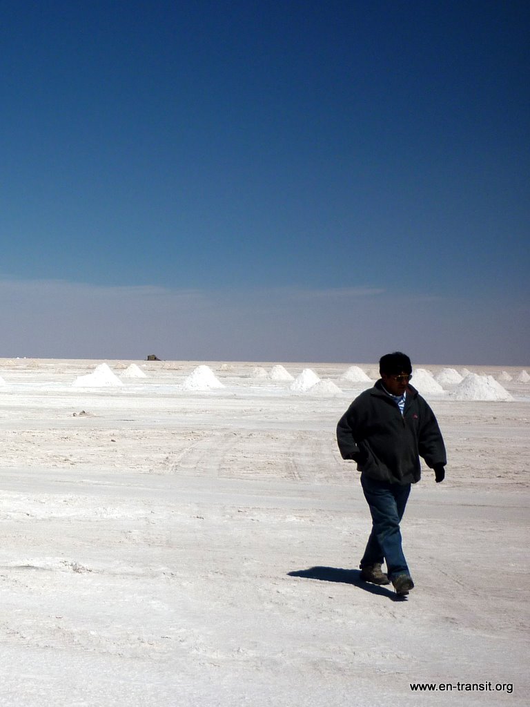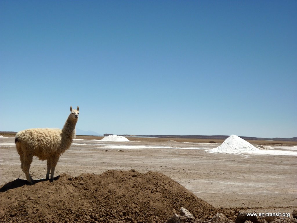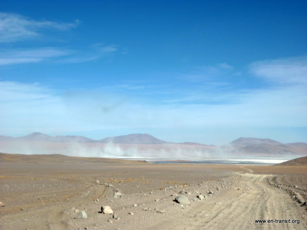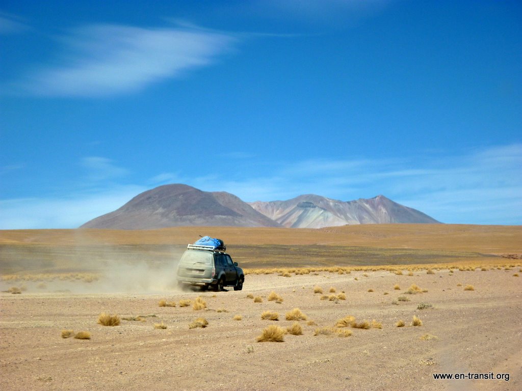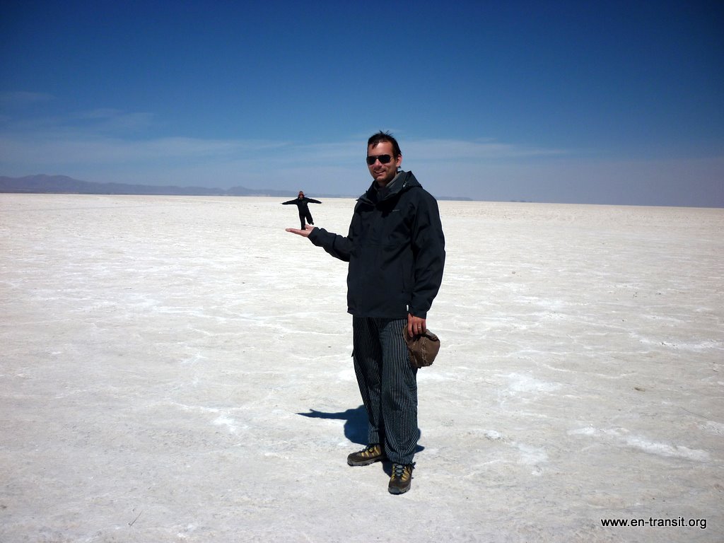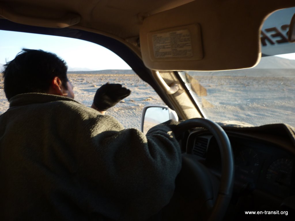 Notre chauffeur, Primo, est peu loquace et n'est guide que sous la torture. Par contre pour ce qui est de la picole, comme nombre de ses collègues, il est loin d'être le dernier. Il est rentré en titubant de sa folle soirée et a été vu avec une bière à l'aube. Aussi le matin du second jour, nous lui trouvons un air bien fatigué : il baille toutes les 2 minutes et fais de nombreux écarts sur la piste... Heureusement, la piste en question est large et, au pire, au delà de la piste, ben... c'est totalement plat :) Donc, il y a peu de chance de mourir d'une sortie de route. Nos seuls moments de frayeurs réels sont quand nous croisons des camions. Pour nous rassurer, il se remet un coup de gnôle à chaque arrêt : son haleine chargée à chaque retour dans le 4x4 en témoigne. Par ailleurs, il ne se nourrit que de feuilles de coca, ou se fait payer à manger dans les bouibouis où il amène ses touristes... pendant que nous attendons bêtement à l'extérieur.