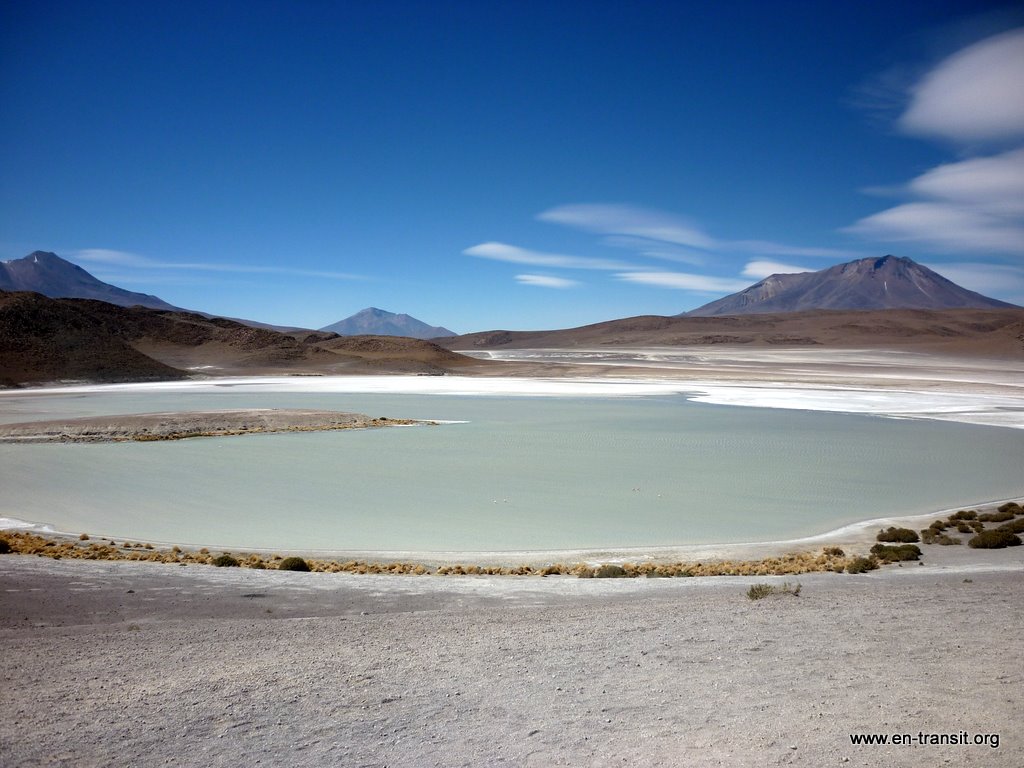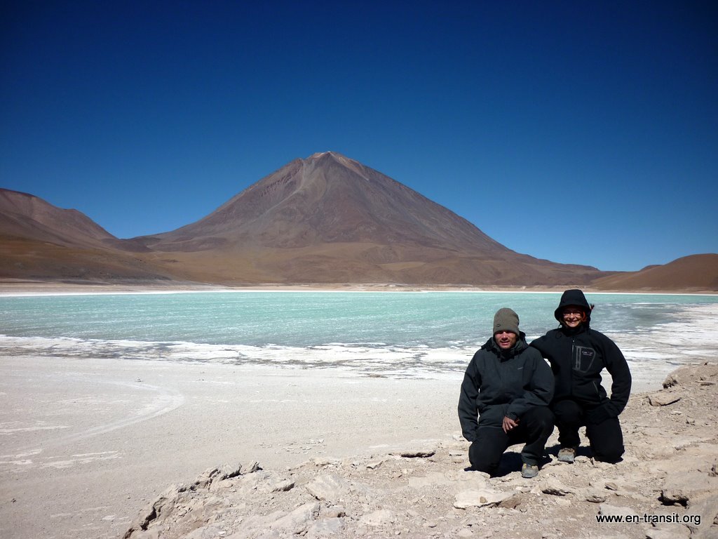Nous approchons la laguna blanca et la laguna verde sur fond de volcan avant de rejoindre le poste frontière (une petite cahute au milieu de nul part).