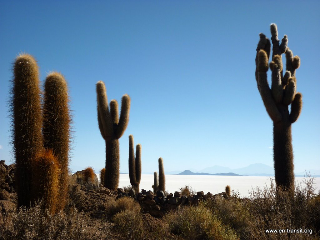 Nous traversons le salar avec des haltes à l'hôtel de sel et sur l'île Incahuasi (morceau de terre rempli de cactus en plein milieu du salar).