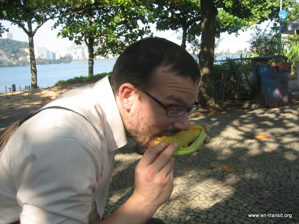A lagoa das Freitas, nous avons goûté le maïs bouilli entier que l'on grignote avec une sauce au beurre (comme dans les séries américaines). Nous y avons aussi dégusté un hot-dog très chargé : pain, saucisse, tomate, oignon, petit-pois, œufs de caille, raisin sec, maïs. Ça tient bien au corps...