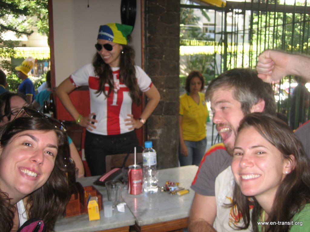 Nous avons retrouvé Wolf (ami d'ami allemand, travaillant actuellement à Rio) et son amie Bebel (prononcer "Bébéou" - une carioca pure souche) à 2 pas de notre auberge pour aller à une soirée Festa Juninha. Cette fête traditionnelle se termine traditionnellement par un mariage (nous ne sommes pas restés assez tard pour le vérifier) et on y danse ce que j'appellerais la danse du tunnel (ressemblance très forte avec ce que l'on fait dans certains mariages : 2 par 2, les gens se tiennent les mains pour former un tunnel sous lequel passent d'autres personnes qui se placent ensuite au bout du tunnel pour le rallonger) et certains viennent déguisés plus ou moins en campagnards (les filles sont des campagnardes trèèès branchées! Et avec mes sandales, mon pantalon bouffant et mon T-shirt tortues d'Ilha Grande, j'ai l'air tâche... En même temps, dur d'être sexy quand on a toutes ses affaires sur son dos!). Bon, à part ces 3 points particuliers, ça ressemble comme 2 gouttes d'eau à une soirée étudiante mais avec une moyenne d'âge autour de 30 ans. Le lendemain, nous avons regardé avec Wolf, Bebel et quelques unes de leurs amies le match Brésil/Portugual dans un petit café de Laranjeiras (autre quartier de Rio).