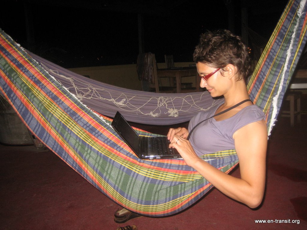 Notre dortoir est équipé de ventilateurs, ce qui n'est pas un luxe... A peine sorti de la douche, il faudrait en reprendre une. Nous croisons dans cette auberge un irlandais qui parle très bien français et qui lui est un vrai de vrai : il voyage à travers toute l'Amazonie, campant des semaines entières dans la jungle équipé de son hamac-tente avec moustiquaire intégrée. Pour les connaisseurs, nous apercevons de loin Lisbeth Salander (l'héroïne de « Millenuim » comme on se l'imagine : maigre, pleine de tatouages et de piercings et toute la journée sur son PC).
