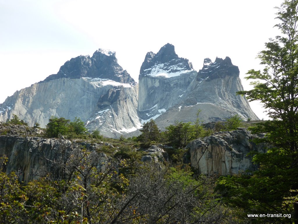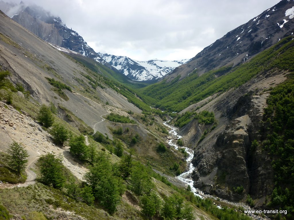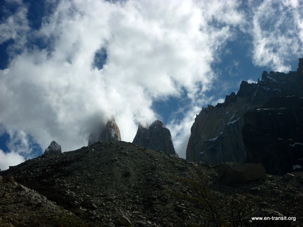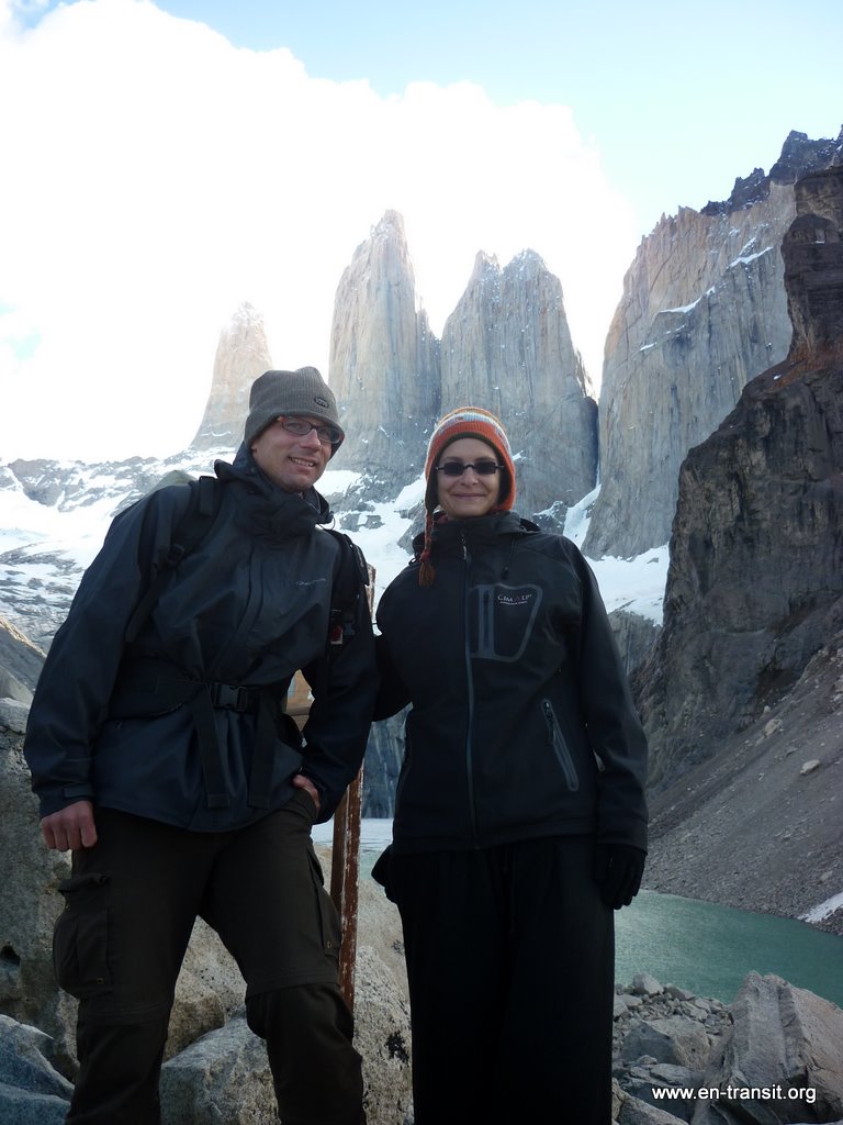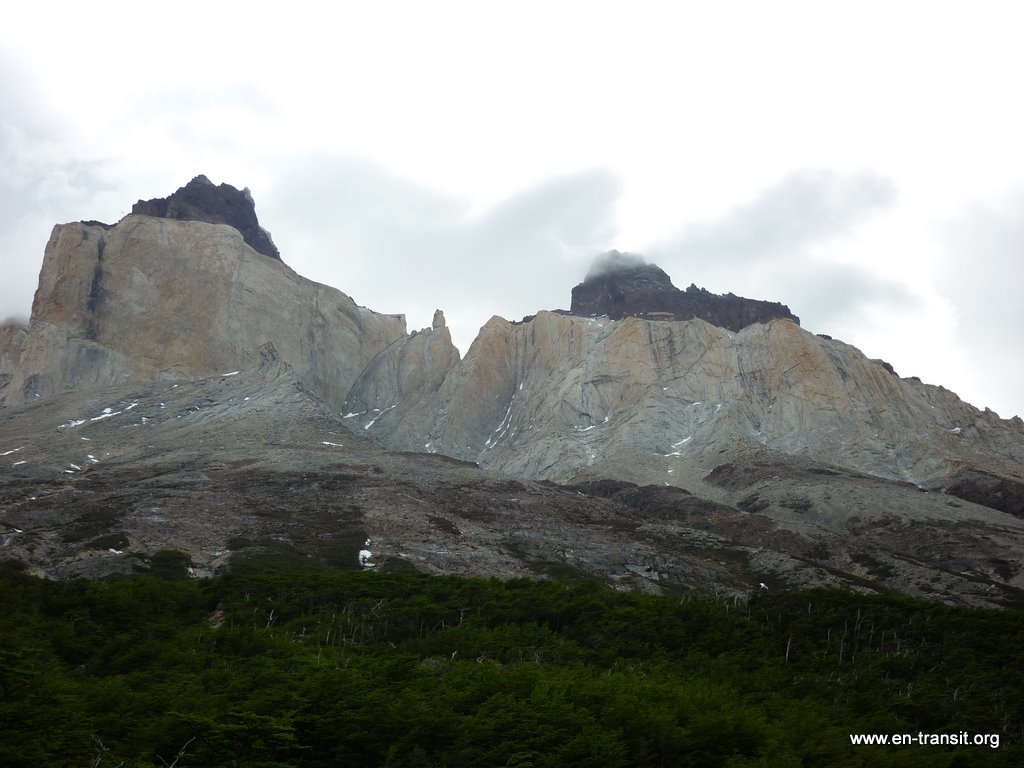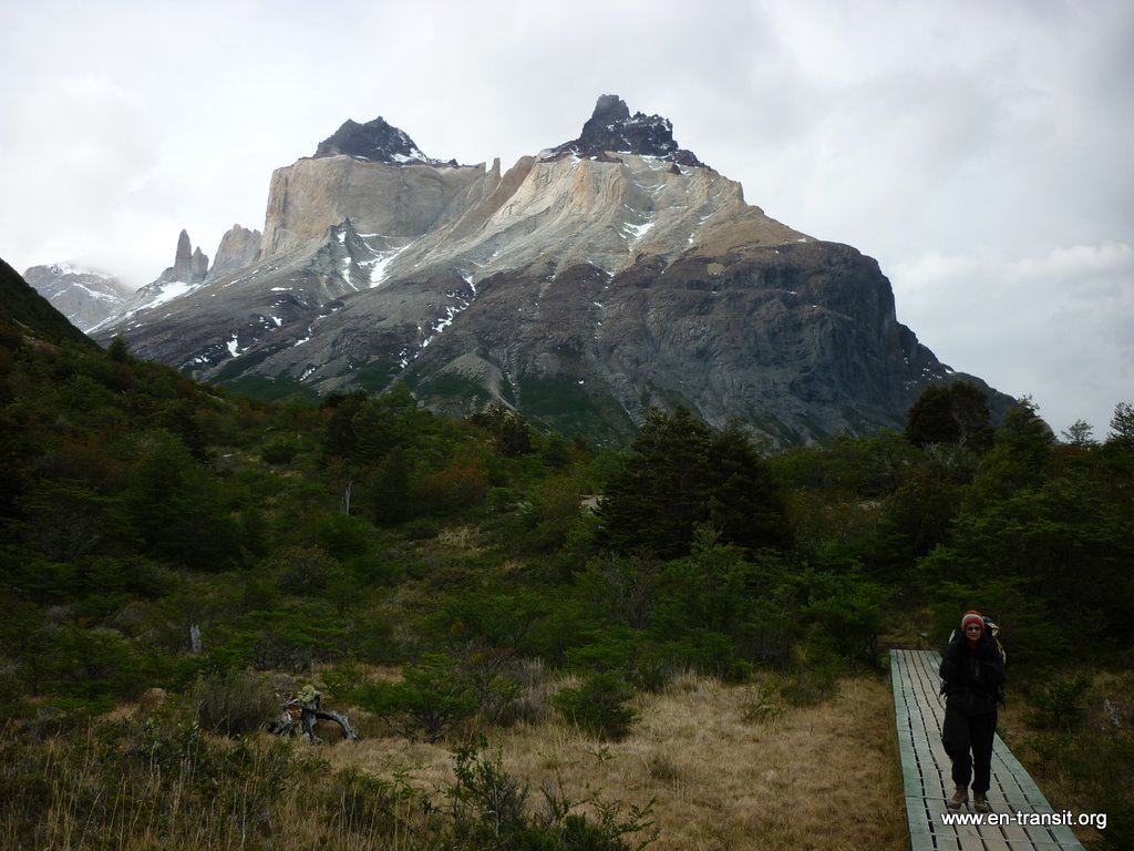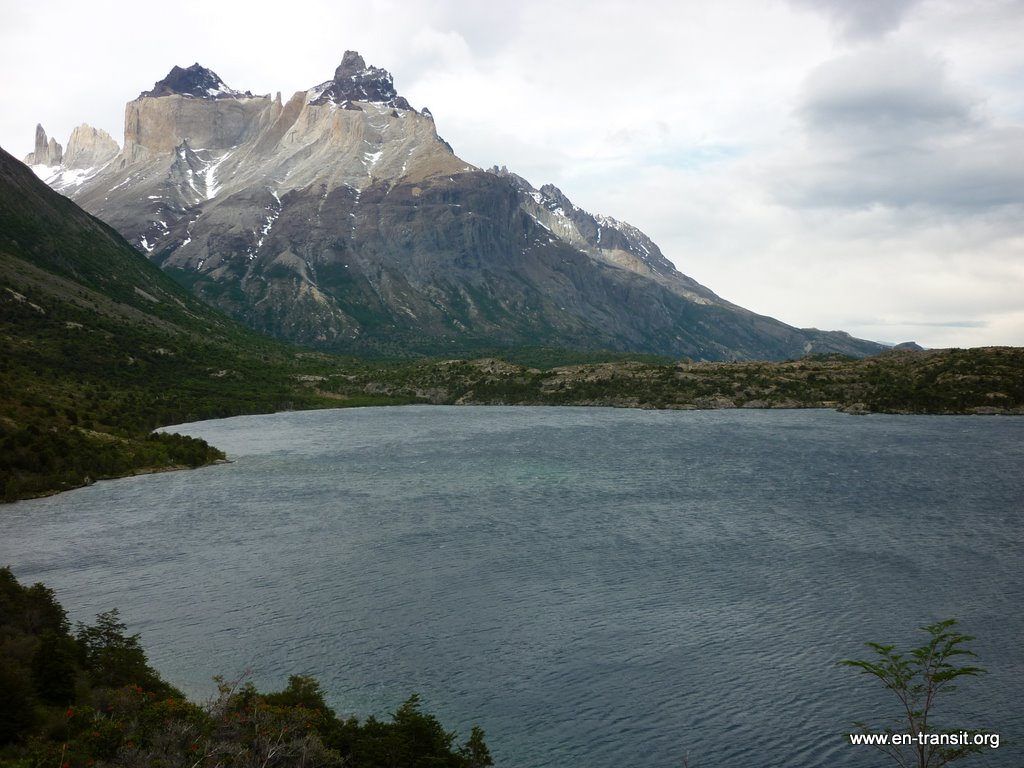 Le lendemain, lever vers 8h. Nous n'avons pas eu le courage de nous réveiller à 5h pour aller admirer le lever de soleil sur les tours :( Nous aurions peut-être dû : c'est humide et on ne dort pas bien. Une longue journée de marche nous attend et nous décollons dès le petit-déjeuner avalé. La descente jusqu'à la base du W se fait tranquillement, puis nous longeons un énorme lac en direction de la vallée Francès avec vue sur Los Cuernos. Le temps magnifique se couvre en fin de journée. Ne voulant pas nous prendre une saucée avant d'avoir monté le bivouac, nous nous installons au camping Italiano situé à l'entrée de la vallée au lieu du Britanico situé au cœur de celle-ci.