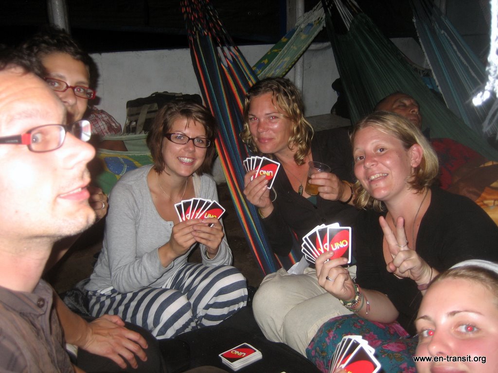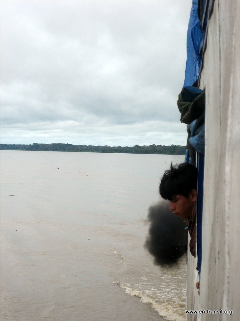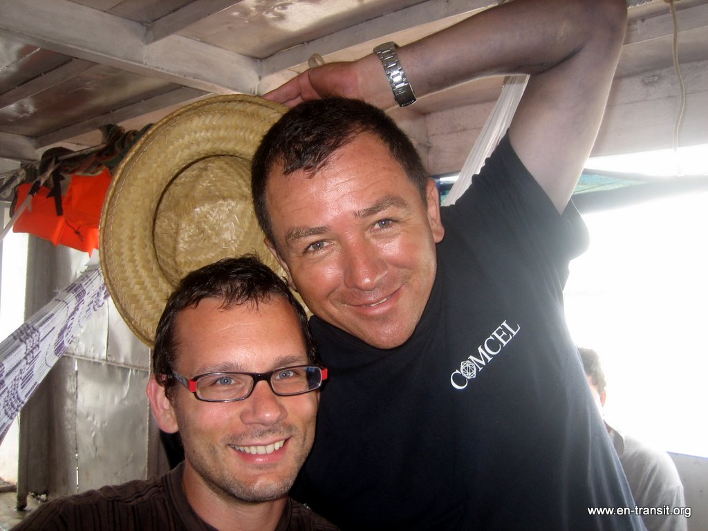 Nous avons fait quelques très belles rencontres. Renaud a discuté avec Lelis, chaman qui part travailler à Iquitos pendant la saison touristique et Bernardo, un colombien de Medellin, ingénieur en téléphonie, qui lui a tapé dans le dos dès notre arrivée sur le bateau et qui apparemment souhaitait vivement faire des rencontres. Il a également parlé à une sœur témoin de Jéhovah très gentille. Par contre, sa collègue est venue prêcher la bonne parole et chanter pendant une bonne demi-heure, en espagnol, à nos copines Kate et Laura qui ne comprenaient pas un mot et n'en connaissaient pas assez non plus pour le lui dire! Quant à nous, nous avons piqué un énorme fou rire et gardé le nez dans notre bouquin, en espérant ne pas être la cible suivante!