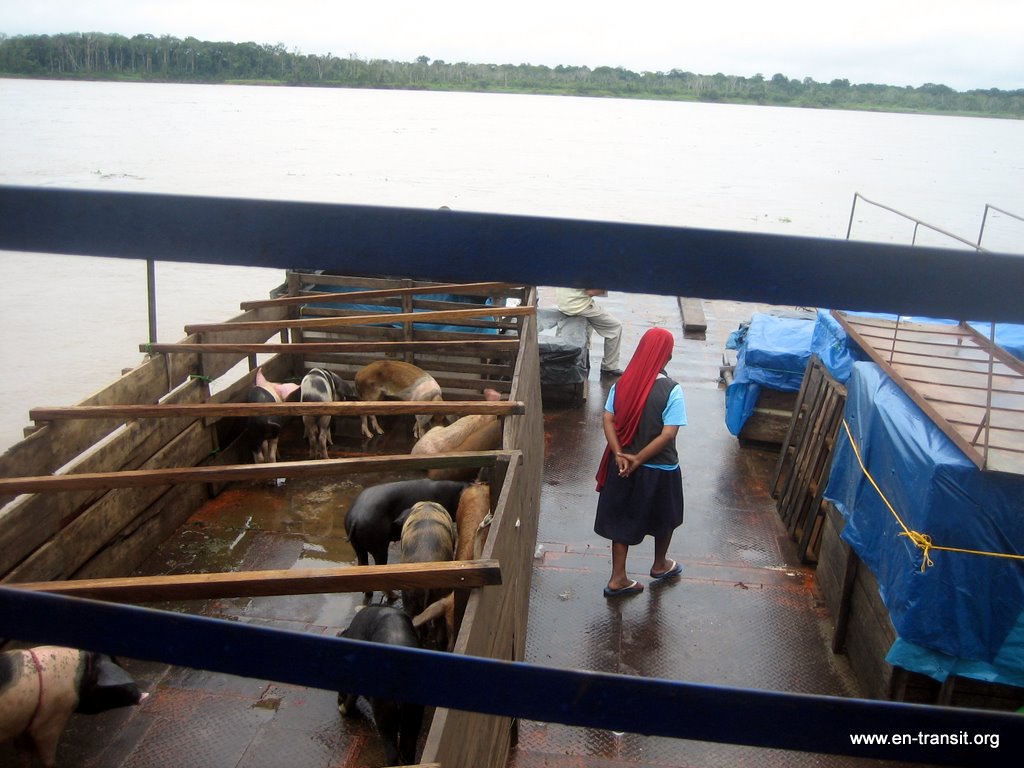 Comme je vous le disais au début, c'est un vrai cargo avec son lot de marchandises. Nous avons eu un lama (pas pris en photo parce qu'il faisait nuit et qu'il a disparu au petit matin) et des cochons! Nous avons vu un monsieur avec quelques perroquets aux ailes coupées. Malgré qu'ils soient très mignons, je suis un peu choquée car je pense qu'ils ont été capturés dans la jungle afin d'être revendus en ville (ça m'a été confirmé plus tard) et je préfèrerais les savoir en liberté...