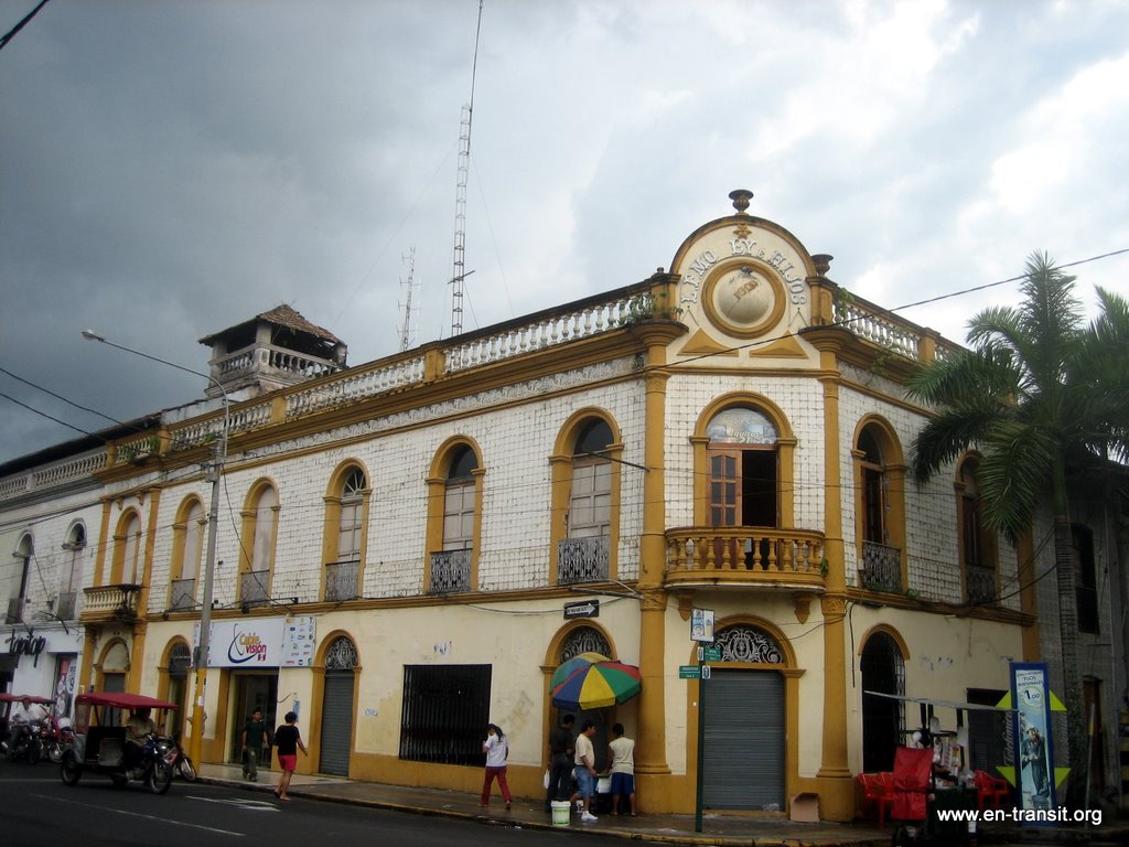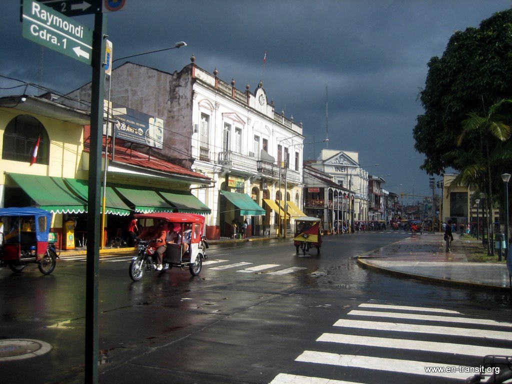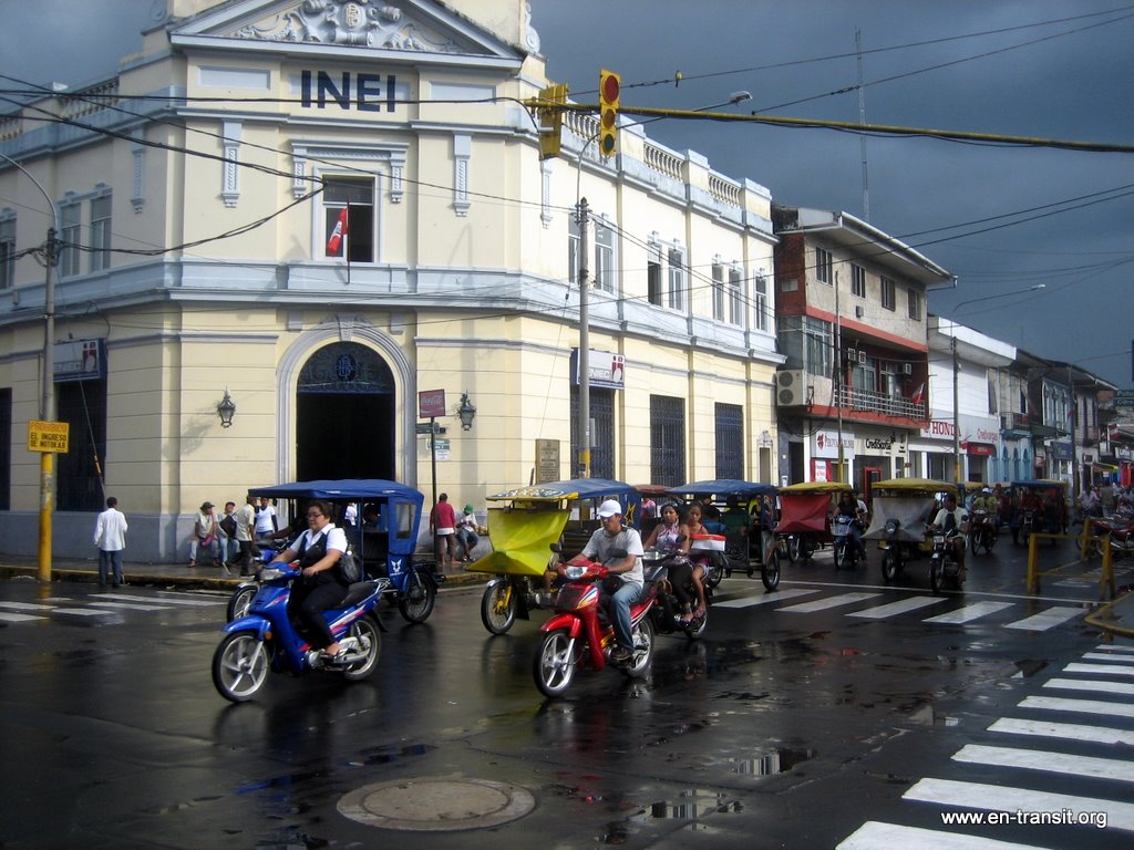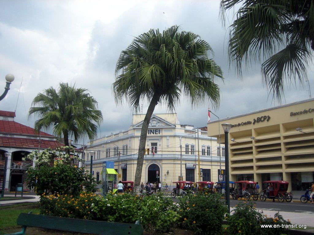 Les offices de tourismes péruviennes ne sont pas encore totalement au point... On y trouve peu d'informations et celles qu'on y trouve ne sont pas toujours pertinentes. Celles de notre guide adoré (Lonely Planet) non plus d'ailleurs. Nous passons donc une première demie journée à flâner dans la ville et à s'accoutumer à l'ambiance péruvienne. La ville est organisée autour de la place des armes (comme beaucoup de ville péruviennes semble t-il). Il y a de nombreux bâtiments coloniaux, traces de l'époque faste on l'on exploitait le caoutchouc de la région. Le centre est très agréable et l'on s'y sent bien malgré le bruit incessant des moto-taxis.