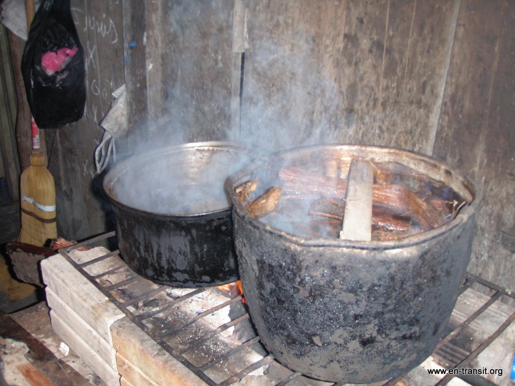Carlos, qui a servi non seulement d'interprète, mais aussi de chaperon, nous a emmené tous les quatre chez le chaman, qui vit à quelques kilomètres du centre d'Iquitos. Il habite dans une maison en bois très modeste, avec quelques chambres, une cuisine avec toilettes intégrées (séparées par une bâche en plastique bleue qui, si elle est rabattue, empêche la lumière d'entrer. D'une intimité folle!). Nous avons rencontré ses enfants et son épouse qui s'occupe elle-même de la préparation de la décoction. Comme Carlos parlait en anglais, certaines informations m'ont échappées. De plus, j'étais un peu stressée par l'expérience à venir, du coup, je n'ai pas tout écouté. Mais, la préparation consiste à faire bouillir plusieurs racines et à les faire réduire jusqu'à l'obtention d'un liquide rouge, épais et huileux.