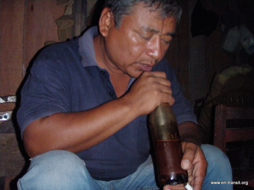 - Il remplit le verre (de la taille d'un verre à gnole ou à peine plus grand) que nous boirons chacun notre tour : 2 doigts d'Ayahuasca, 1 peu de vomitif (je pense), 1 peu d'huile parfumée. Avant de le donner à boire, il souffle de la fumée dans le verre. Je ne me souviens pas s'il y a des incantations...