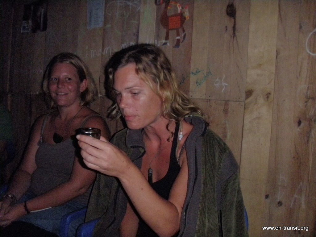 Nous avons pas mal parlé des expériences des autres personnes et des siennes, grâce au concours de traducteur de Carlos. Si vous êtes tentés, je vous conseille d'avoir un bon niveau d'espagnol ou de vous faire traduire. Il nous expliquait que l'Ayahuasca avait des répercussions multi-sensorielles et qu'il fallait garder à l'esprit que tout n'était que produit de notre imagination : ce qu'on voyait, ce qu'on entendait, ce qu'on ressentait... J'étais un peu stressée de ne produire que des choses négatives. Pendant tout le temps où l'on a parlé, le chaman fumait clope sur clope. Dans les croyances indiennes, la fumée éloigne les mauvais esprits et il nous conseillait de fumer pendant la cérémonie. Alors qu'il ventait les vertus anti-cancéreuses de l'Ayahuasca, je n'ai pas pu m'empêcher de me dire « y'a intérêt à ce que ce soit efficace contre le cancer du poumon parce qu'avec tout ce qu'il fume... » Et puis, je m'en suis voulue d'être aussi cynique : ça commence bien, je ne fais même pas semblant d'y croire! Peut-être que j'ai la trouille et je me défend en utilisant le scepticisme comme arme de défense? Ceci dit, plus il parlait, plus il donnait à ses propos un goût de charlatanisme. Il était temps qu'on commence l'expérience en elle-même.