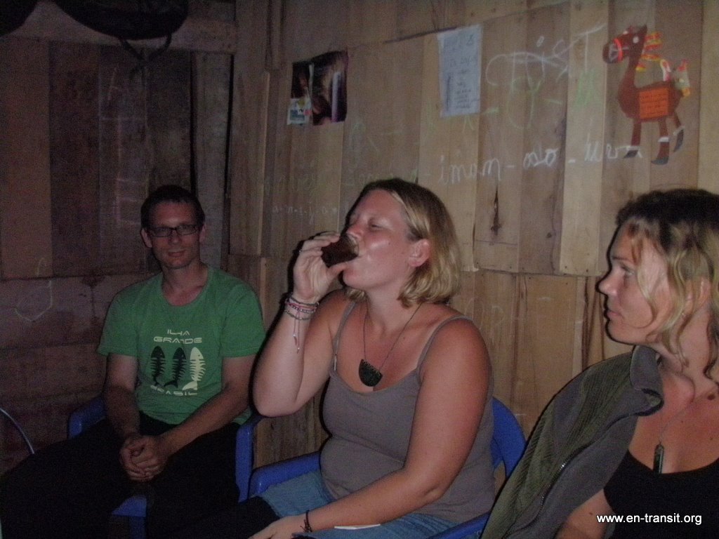A notre retour de la jungle, les Sarah nous ont annoncé qu'elles avaient trouvé un chaman, recommandé par Carlos, un des guide, et qu'elles avaient l'intention de tenter l'expérience le soir même. La perspective d'être entourée par des personnes de confiance m'a convaincue d'essayer également. Renaud aurait préféré faire ça dans la jungle, il n'était donc pas sûr de boire l'Ayahuasca avec nous. Il souhaitait tout de même venir, ne serait-ce que pour découvrir la cérémonie et veiller sur nous. Nous avions convenu que si nous ne « sentions » pas le chaman, nous pourrions refuser. A 15h, nous arrêtons donc de manger car pour la cérémonie, il est recommandé d'être à jeûn depuis quelques heures (difficile de savoir combien, mais je me dis que 6h, comme avant une chirurgie, ça doit pas être trop mal!) et vous comprendrez ensuite pourquoi!