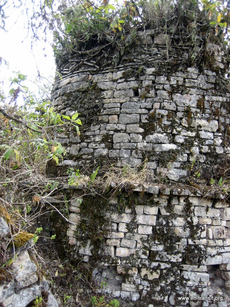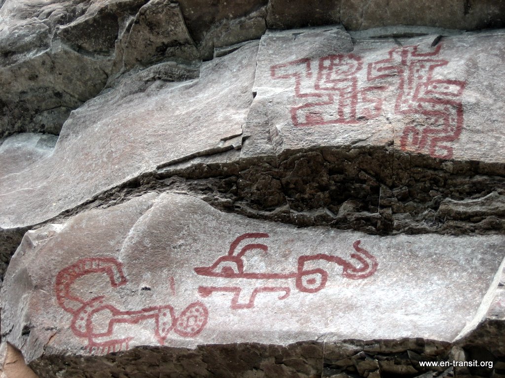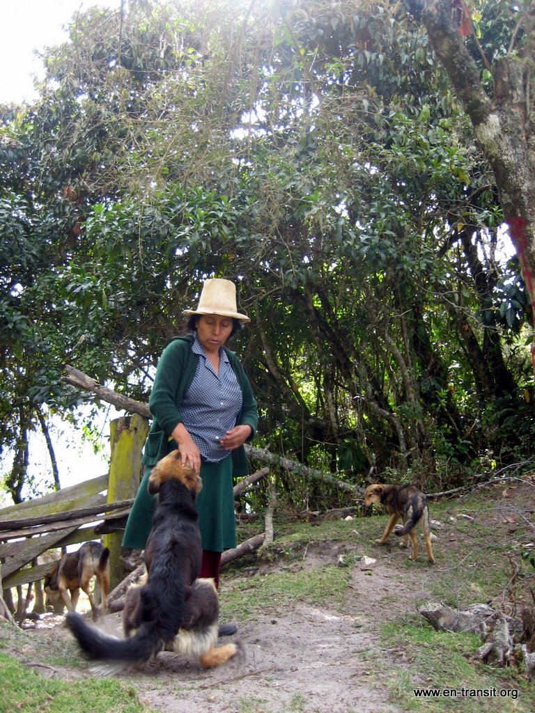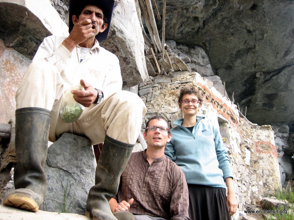 Sur le chemin du retour, Renaud aperçoit des paysans et décide de leur demander le chemin. Bien lui en a pris, c'est Regina Medina Atalaya, gardienne du site et sa famille qui travaillent. Et évidemment, la maison avec les molosses est la sienne, nous ne nous étions pas trompés. Les chiens nous accompagnent durant la visite et ils n'ont plus rien des bêtes féroces du matin! Au début, les ruines sont un peu décevantes : quelques pierres, des formes de maisons... Mais Regina sait maintenir le suspens et plus on avance, plus les maisons sont bien conservées et impressionnantes : des escaliers encore fonctionnels, des terrasses, de belles frises décoratives, des pans de murs immenses, cachés par la végétation... Nous discutons un peu avec ce petit bout de femme avant de redescendre. Nous sommes ravis d'être arrivés à nos fins!
