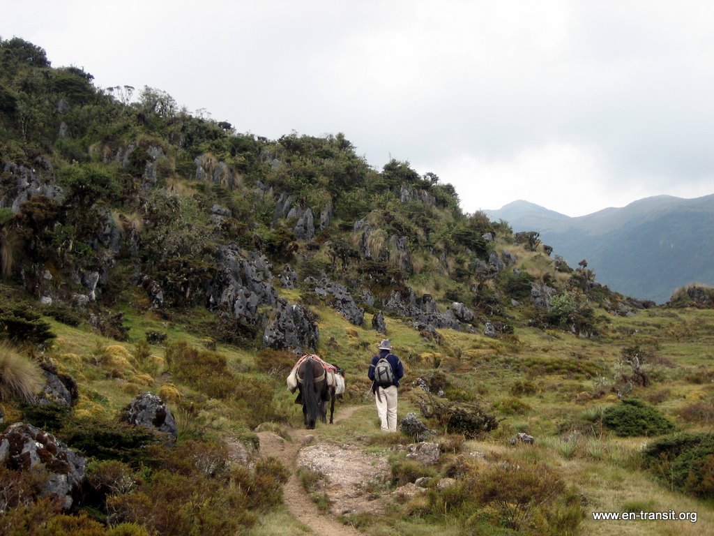 Évidemment, nous sommes les seuls à cheval. Clemente marche derrière ou à côté. Il mâche en permanence des feuilles de coca et y ajoute du jus de citron qu'il a dans une petite calebasse : ça provoque une réaction chimique et a comme propriété de supprimer toute sensation de soif ou de fatigue. Du coup, c'est un peu de la triche! Les chevaux connaissent le chemin par cœur, nous n'avons donc pas besoin de grandes connaissances en équitation. D'ailleurs, je commence à être de plus en plus à l'aise, ce qui est plutôt paradoxal car, je ne comprend pas ce que dit le guide, nous n'avons aucune indication sur la manière de guider les chevaux et bien sûr, pas de bonde ridicule mais pourtant protectrice sur le crâne. Comme quoi, quand je n'ai pas le choix, je me pose moins de questions et j'ai moins peur! Les paysages sont très différents durant les dix heures que durent la randonnée (CF les photos parce que c'est pas simple à décrire...). Nous passons un col à 3700m. Lorsque les chevaux montrent des signes de fatigue, nous marchons.