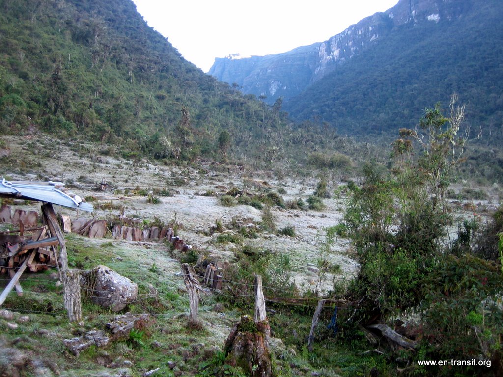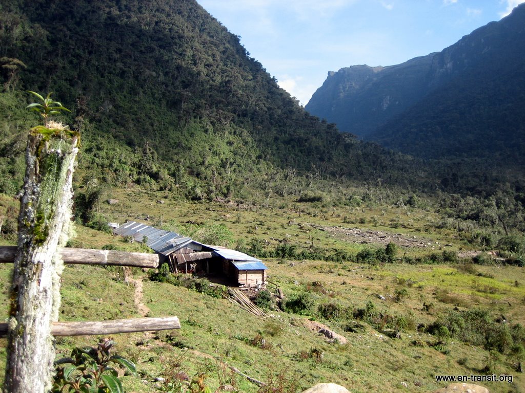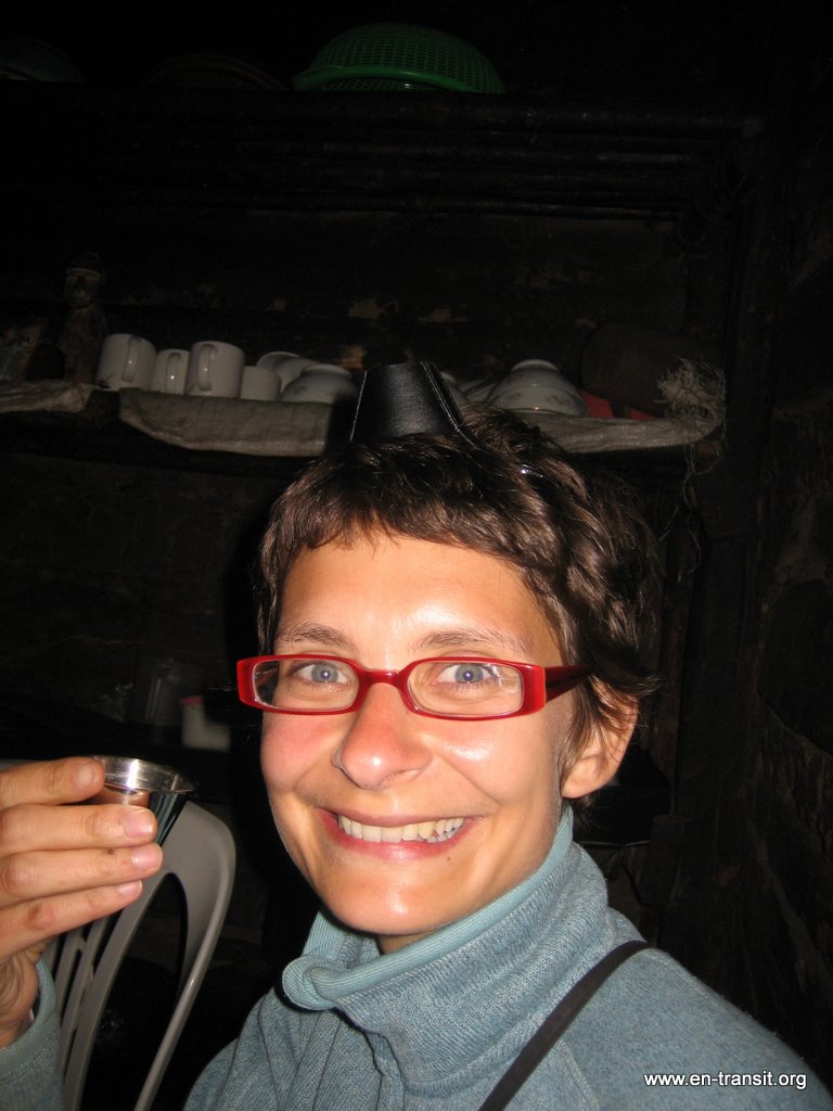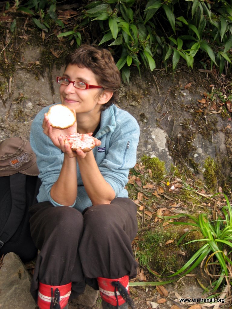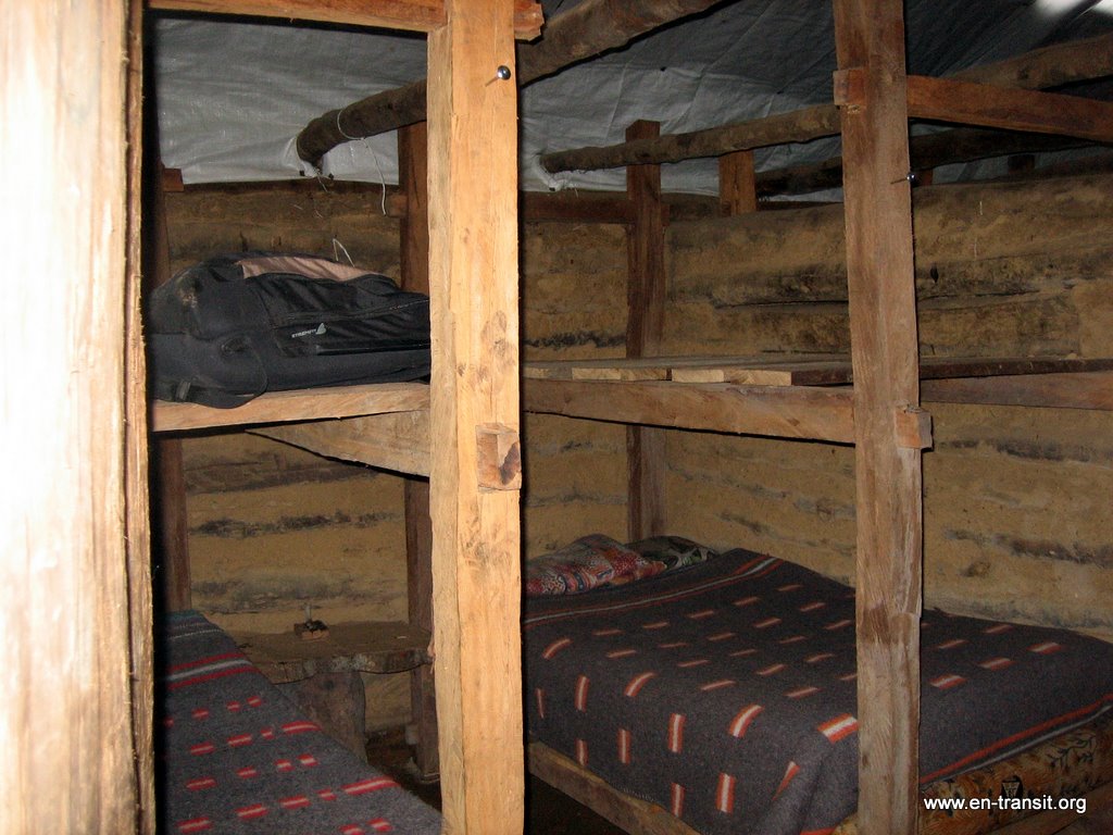 Pendant la descente, je met le pied dans une flaque de boue. C'est comme le pantalon : waterproof, mais plus quand ça passe par-dessus! Du coup, on chausse nos bottes de 7 lieux avec la formidable impression de marcher pied-nus. Nous arrivons à l'auberge qui est plus que sommaire. Chaque chambre est équipée de lits superposés et de matelas. Il fait froid et heureusement, les couvertures sont fournies mais pas les draps. La maison est en bois, le sol en terre battue et le toit est une bâche en plastique. Il n'y a pas d'électricité évidemment, pas de douche, mais des toilettes pour hommes et pour femmes bien distincts (si c'est pas la grande classe!) L'eau de la montagne est absolument congelée! Se laver les mains relève du défi, alors vous pensez bien que le reste attendra notre retour à la civilisation!