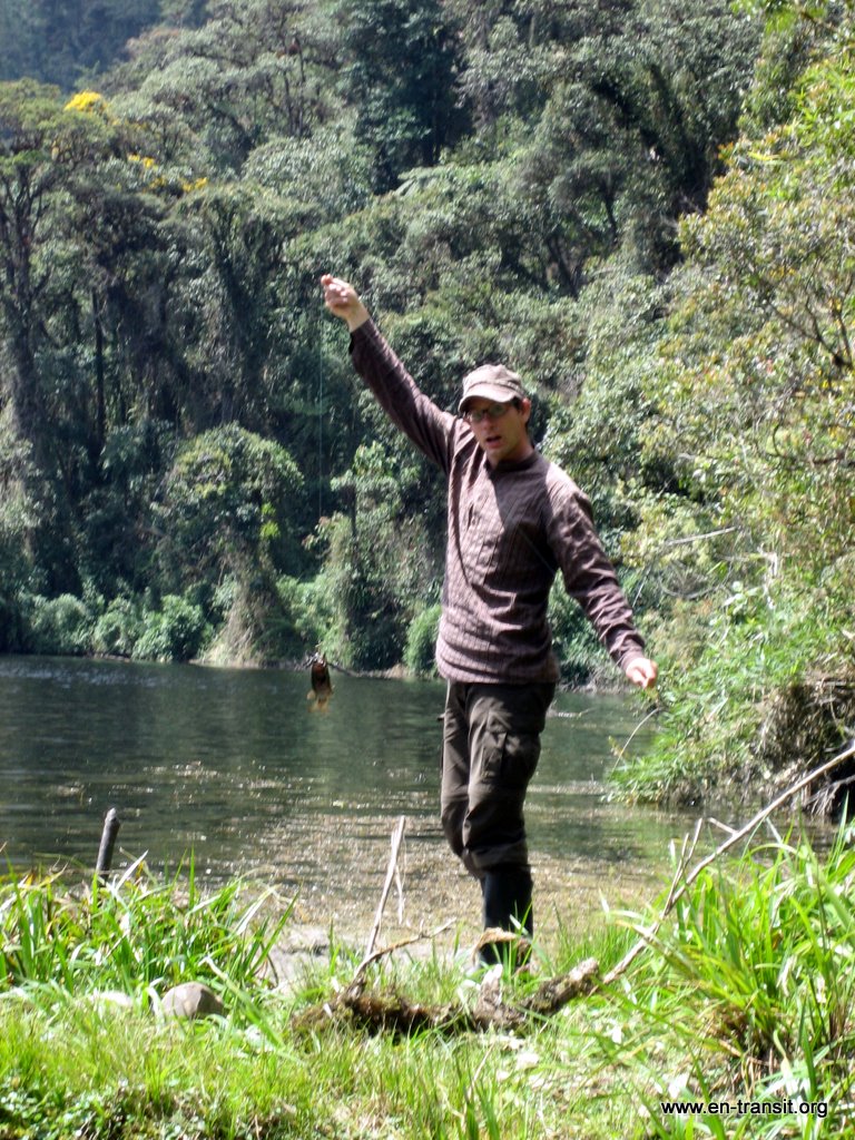 A l'aube du mercredi 18 août, je me réveille avec un an de plus : j'ai 30 ans! Nous partons avec Clemente en direction du lac où nous passerons la journée : la vue du haut de la colline est superbe. Nous dérangeons quelques vaches et veaux en traversant les pâturages et croisons les vestiges d'un ancien village. Clemente nous enseigne la pêche à la mouche (qui se dit pêche au papillon ou « mariposa » en espagnol) car la truite sera notre repas de ce soir. Renaud en attrape une sans faire exprès, mais il est le premier à remplir le garde-manger!