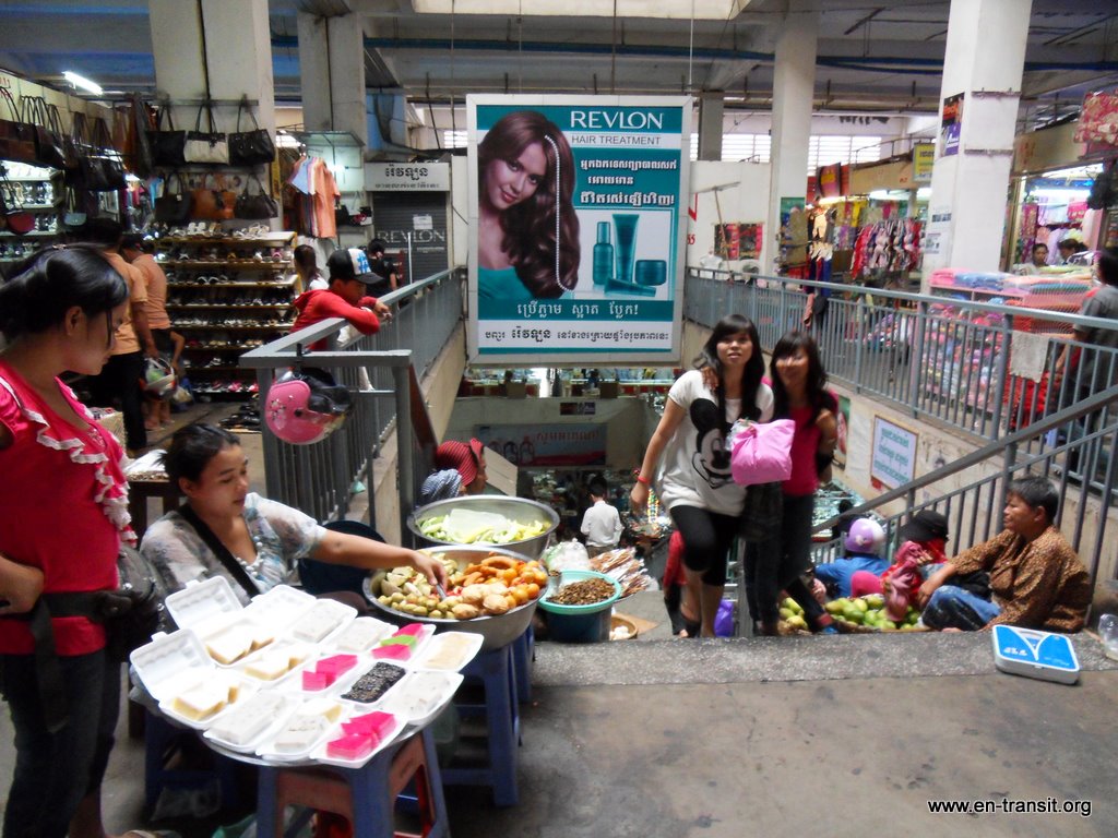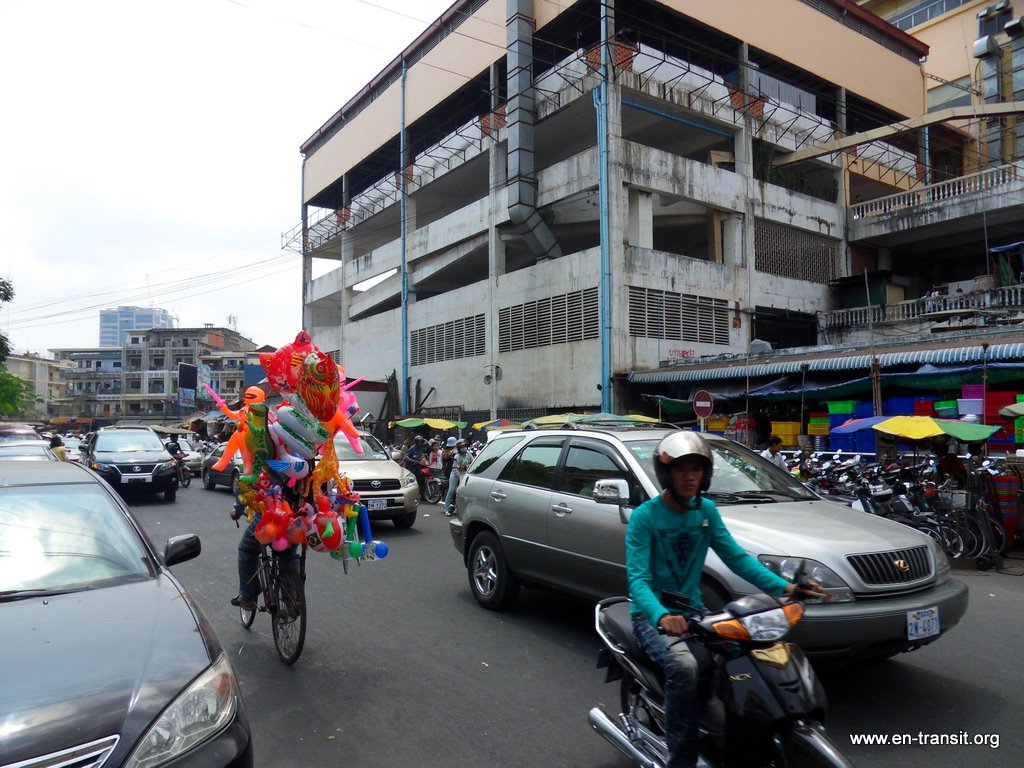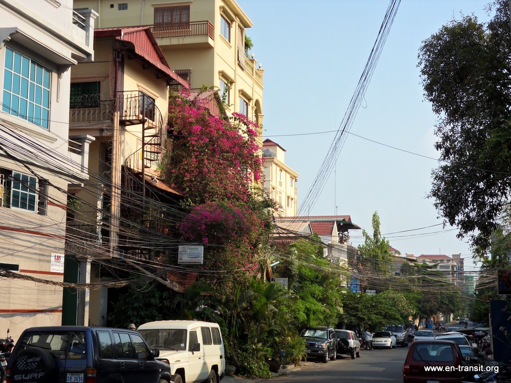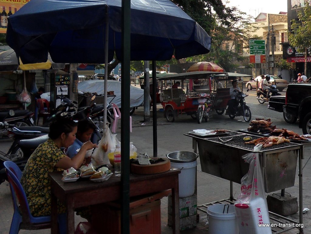 Peu après notre arrivée, nous nous mettons à la recherche d'un distributeur de riels (la monnaie locale). Chemin faisant, nous croisons un gamin déféquant à même le caniveau... Bon, le quartier semble moyen. Après plusieurs DAB distribuant uniquement des dollars, nous nous mettons en tête qu'il faudra faire avec, même s'il nous plait peu de payer avec une autre devise que celle du pays. Au pire, nous ferons du change plus tard, mais ils sont acceptés absolument partout et tous les prix sont affichés en dollars... Étrange, mais pourquoi pas...