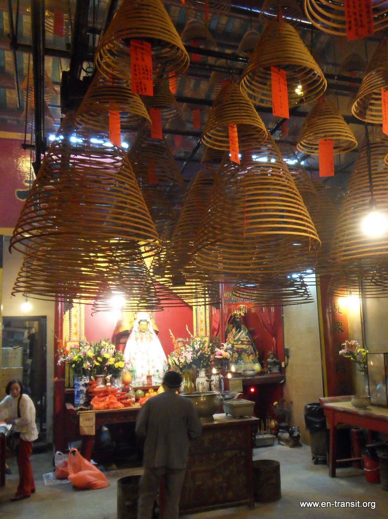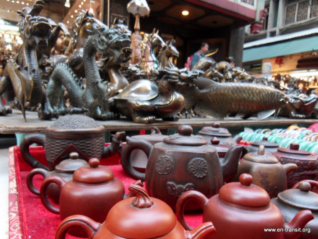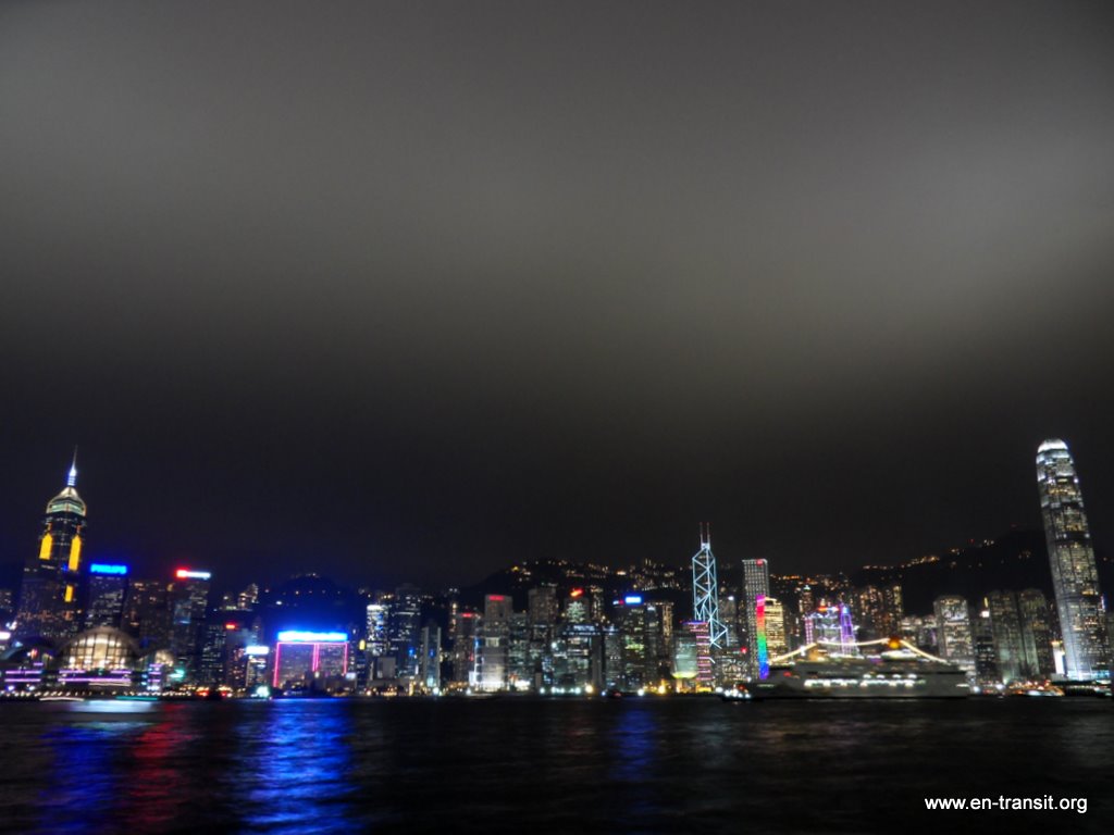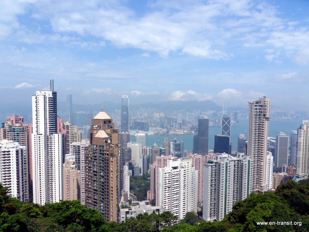 Nous avons parcouru la ville, impressionnés par la taille des buildings. Contre toute attente, nous l'avons trouvée plutôt jolie et agréable, même si elle n'est pas tellement faite pour les piétons : trop de passerelles, de bretelles, d'échangeurs, de niveaux, qui rendent le repérage et l'évolution difficiles . Un coup de funiculaire nous a permis de découvrir la vue sur la ville depuis le quartier « The Peak ». On a eu une chance inouïe avec le temps clair. Nous avons arpenté les rues du « vieux » Hong-Kong avec le temple Man Mo, Hollywood Road et ses antiquités, Cat Street et ses babioles en tous genres, emprunté les escalators qui mènent au quartier Mid-Level. Ceux-ci vont dans le sens de la descente de 8h à 10h, pour permettre aux habitants d'aller travailler et vont dans le sens de la montée le reste de la journée ! Nous avons fait un petit tour en tramway. Ils sont hauts et très étroits pour mieux circuler dans les petites rues. Nous avons tenté notre première cantine au marché de Sheung Wan Fong. Heureusement la carte était traduite en anglais... Ca ne sera sûrement pas la même partout ! Nous avons fait un tour à Kowloon à la recherche de la bonne affaire informatique (ce qui n'est pas vraiment évident quand tout est en chinois... ) Puis nous avons assisté, médusés, au son et lumière qui a lieu tous les jours à 20h. De la musique kitsch, des jeux de lumière tout aussi kitsch... Intéressant ! En tous cas, la ville est magnifique de nuit avec toutes ses lumières !