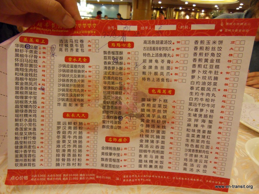 Le lendemain matin, nous allons dans un salon de thé manger des « dim-sum », la spécialité de Guangzhou. Bon, comme je ne me suis pas trop renseigné, on passe un peu pour des crétins. Nous demandons des « dim-sum » (avec notre petit carnet) et la nana nous file une carte complète et attend notre sélection. Du coup, je lui répète que je veux des « dim-sum », @&#?§!*%!$!... Bon, nous finissons par comprendre que c'est un peu comme les tapas : il y en a plusieurs sortes et il faut donc choisir. Aaaaarrrgggg ! Plouf, plouf, ce sera toi que je mangera ! Des raviolis-vapeurs aux crevettes, des nems... On arrive tout de même à commander autre chose que des pattes de poulet cette fois-ci.:)