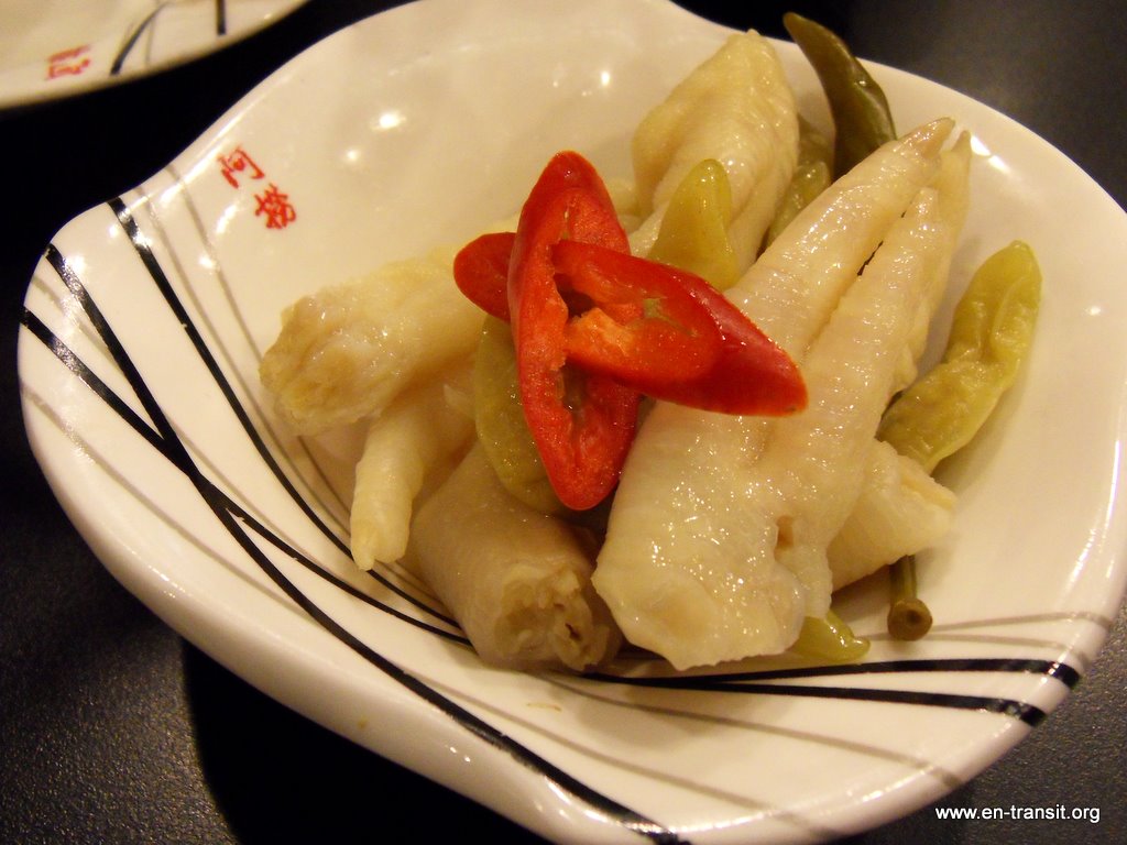 Le soir rebelote pour commander à dîner au resto. Pas moyen de comprendre quoi que ce soit même avec les traductions du guide... Va reconnaître un signe chinois, même simplifié, parmi 4 pages de signes qui, de notre point de vue, se ressemblent tous... On se paye une bonne tranche de rigolade, partagée avec les serveurs qui défilent tous pour venir voir nos trognes, quand je finis par commander des pattes de poulet au piment... Les chinois raffolent de ça et je ne comprend vraiment pas pourquoi. Il n'y a que de la peau qui se détache difficilement des os et qui n'a pas goût de grand chose. On dit des cantonnais qu'ils mangent tout ce qui a 4 pattes sauf les tables et tout ce qui possède des ailes sauf les avions ! Ceci explique peut-être cela...