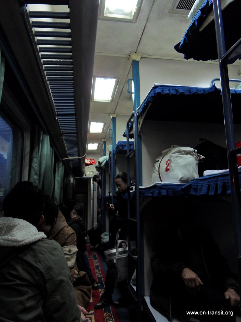 Puis nous rentrons à l'hostel, et tentons de faire un début de programme avant de prendre notre train de nuit pour Guilin. Trop à la bourre pour y aller en métro, nous prenons un taxi qui nous dépose devant la gare. Mais c'est impossible d'entrer, il y a des barrières partout... Ca nous prend un bon 1/4h pour trouver le souterrain qui va bien. Les trains couchettes sont très proches des nôtres. Mais, les compartiments n'ont pas de porte, ils sont équipés d'un thermos, et de l'eau chaude est disponible au bout de chaque wagon : parfait pour des pâtes chinoises instantanées, du thé ou du café. :) Quand vous montez dans le train, le contrôleur échange votre billet contre une plaquette en plastique. Cela lui permet de savoir quand il doit venir vous réveiller. Par ailleurs, quand vous achetez des billets, plusieurs options vous sont offertes : les sièges, les couchettes normales (ce que j'ai décris ci-dessus) et les couchettes confort (pas encore vues).