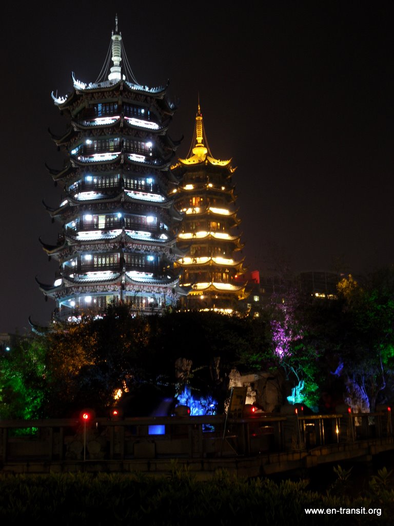 Le train partant le lendemain à 9h, il ne nous reste que cette fin d'après-midi déjà bien entamée pour visiter la ville que nous sillonnons à pied pendant 3-4h. Nous longeons la rivière, observons Elephant Hill de loin, admirons les 2 pagodes « Riyue Shuang Ta » et traversons la vieille ville entourée de remparts.