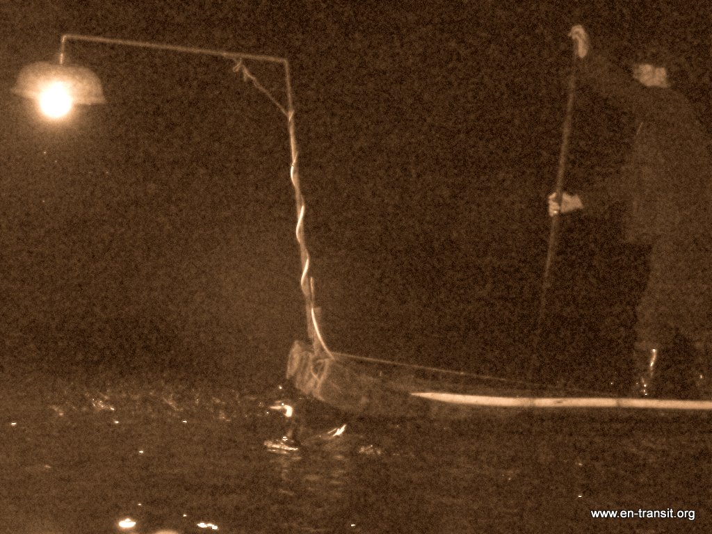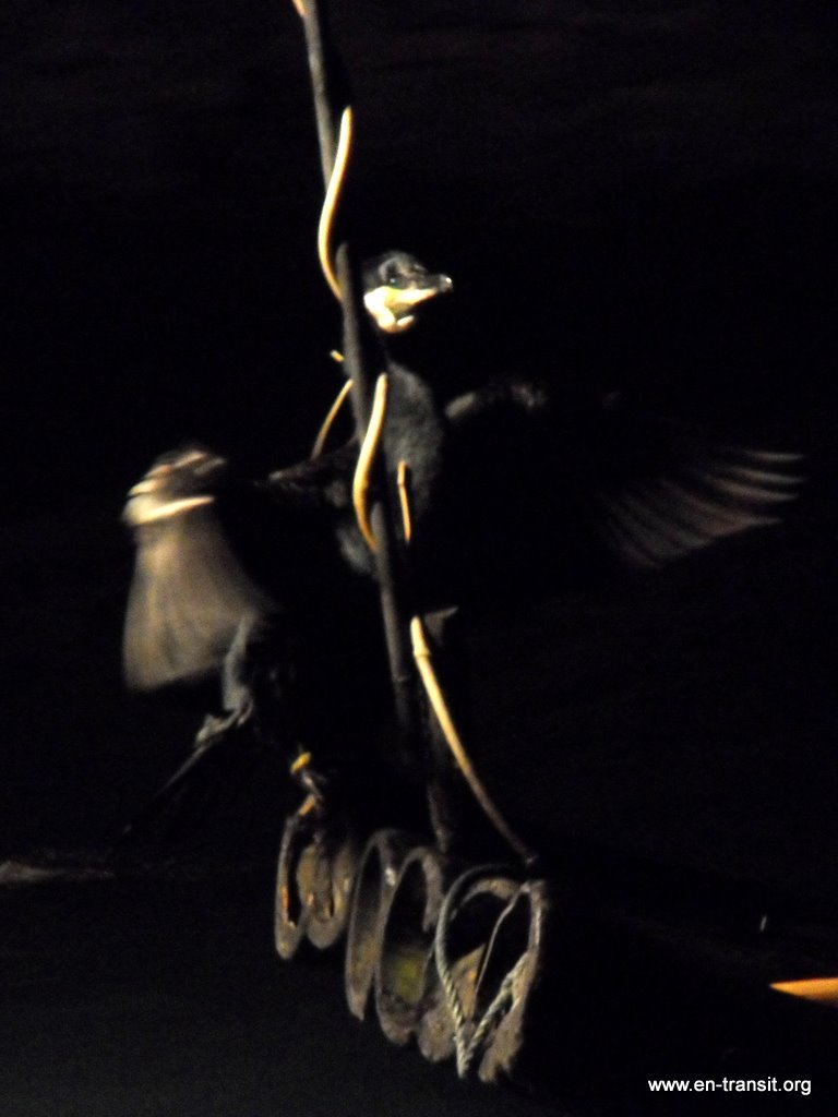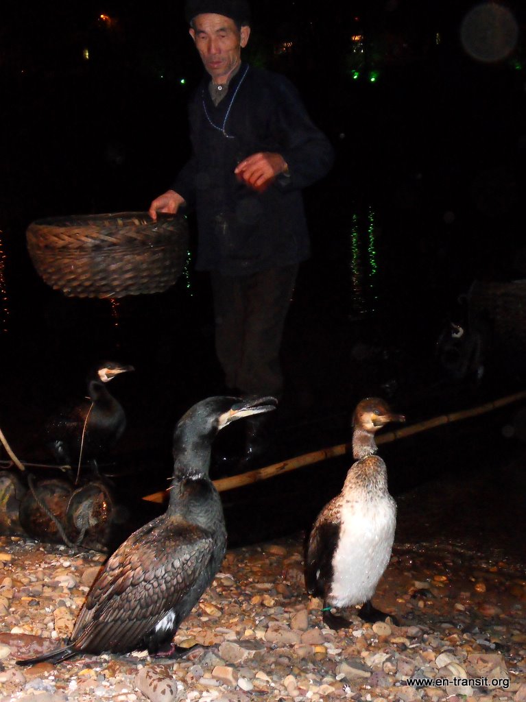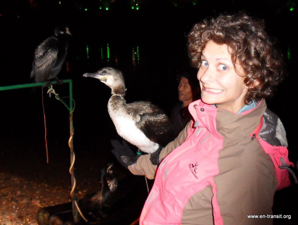 Puis nous nous offrons pour la soirée le « Show des cormorans ». Par ici, la pêche au cormoran est une pratique séculaire. Lorsque les cormorans ont des poissons dans le bec, le pêcheur les sort de l'eau : il les attrape par la cordelette qu'ils ont à la patte, à l'aide d'un long bâton avec un crochet. Puis il leur fait recracher les poissons. En effet, leur cou est serré par une corde qui les empêche d'avaler leurs proies. C'est intéressant, mais je suis un poil déçu. Nous pensions nous retrouver à 2 ou 4 sur un bateau de pêcheur qui nous montrerait la technique. En fait, nous sommes 25 sur un bateau-mouche qui suit le bateau-bambou du pêcheur de suffisamment près pour que l'on puisse voir comment ça se passe.