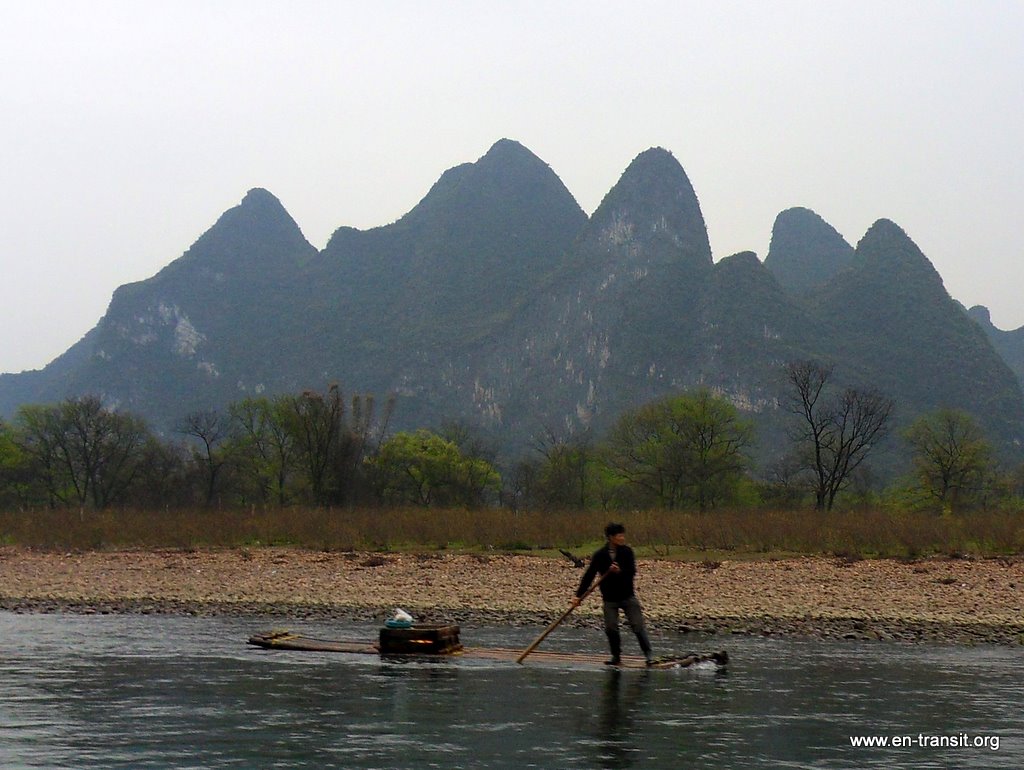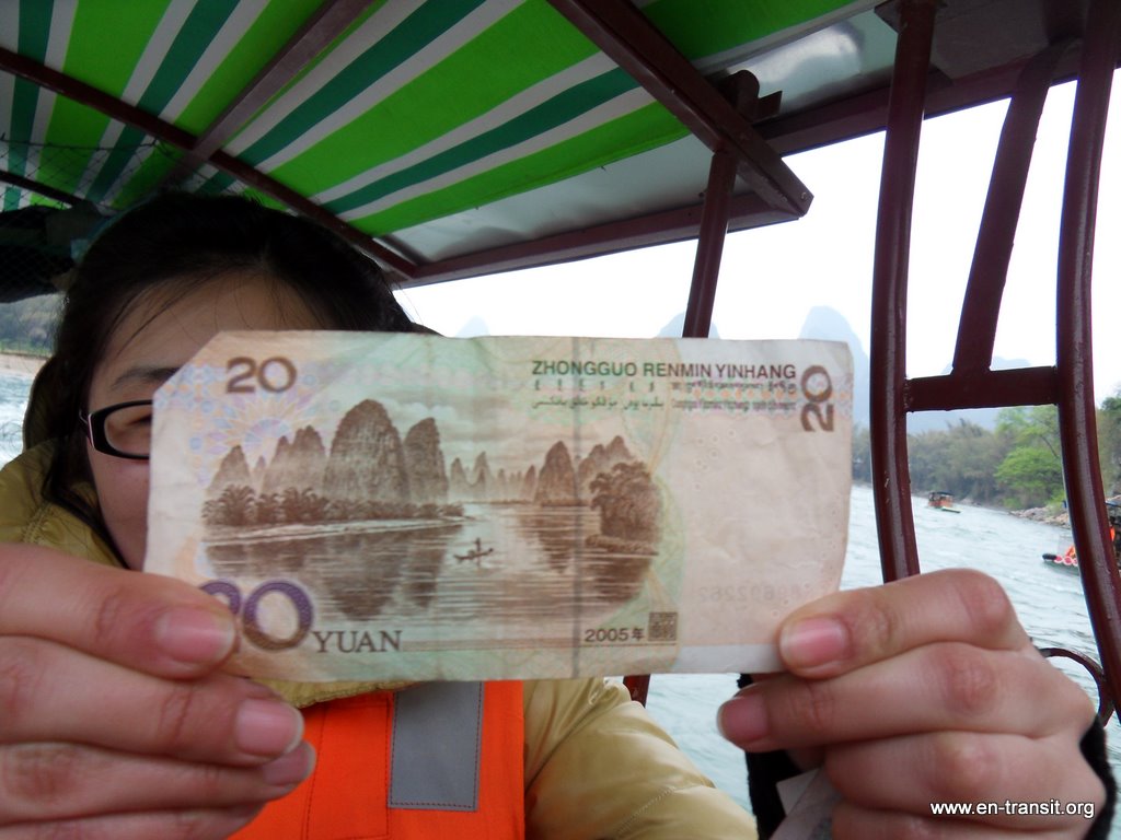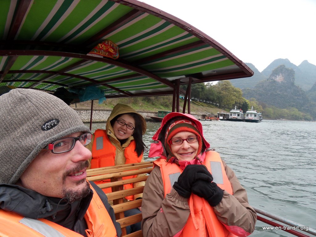 Nous partons à 9h de Guilin avec un chauffeur et Susan, une touriste chinoise de Chengdu. Arrivés à Caoping, nous mettons nos bonnets, nos chaussettes épaisses, nos gants et le maximum de couches possibles. Il pèle et nous allons passer 3h sur un radeau en plein vent et peut-être sous la pluie.:) Du bonheur ! Le conducteur du bateau à une bonne bouille sympa, mais c'est difficile de dire autre chose que « bonjour »... Heureusement, Susan parle très bien anglais et nous traduit 2-3 trucs. Les paysages sont superbes : le dessin sur le billet de 20 Yuans a été pris ici.