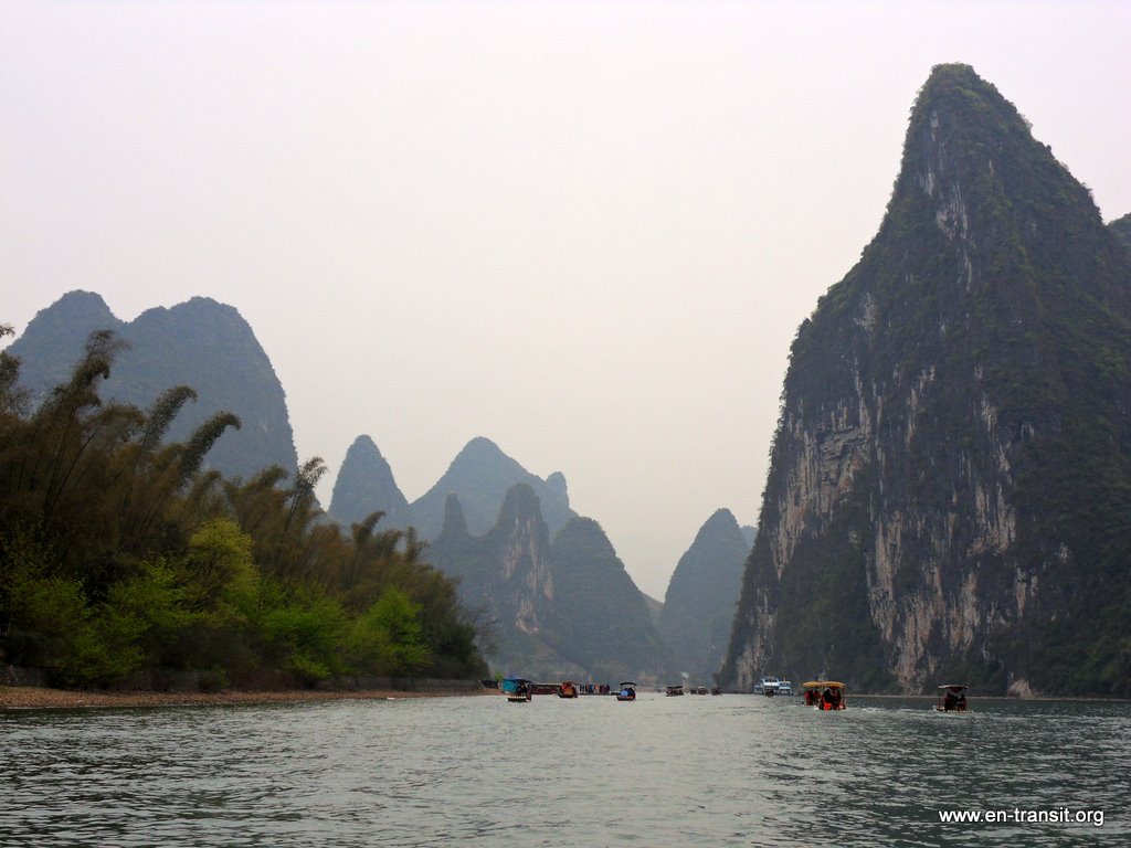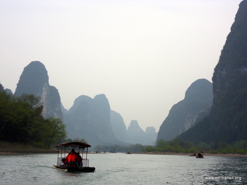 Quand nous arrivons à Guilin à 7h, il fait une vraie caillante et le temps est gris. Au CITS (office de tourisme) on nous conseille de prendre un tour croisière aujourd'hui car le temps va être « superbe » ! Bon, nous hésitons car il est possible de faire le trajet par nos propres moyens, mais après une nuit dans le train et un aperçu de la complexité de communiquer à Guangzhou, nous acceptons.