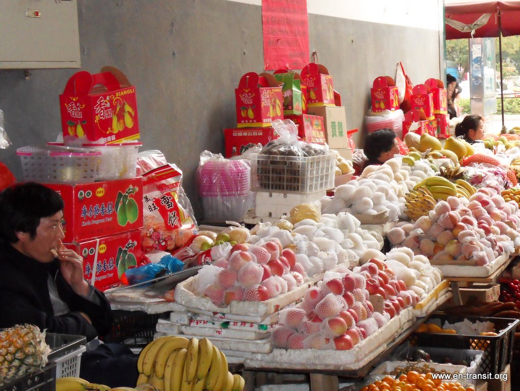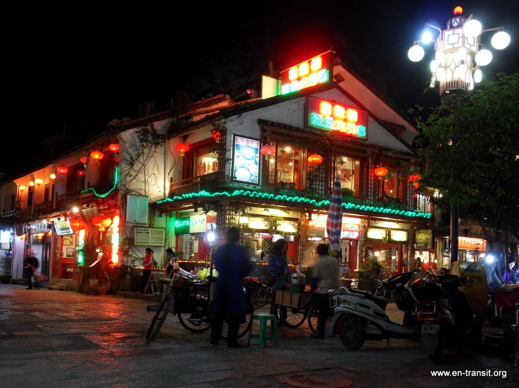 Nous arrivons à Yangshuo vers 14h30 et passons l'après-midi à greloter sous la couette. Il pleut... et il fait froid (je l'ai déjà dit, non?). Heureusement, qu'aujourd'hui devait être une journée « superbe ».;) Notre hostel n'est pas très loin de la gare routière et tout près du marché. Pour le diner, nous découvrons les trop-bons-raviolis-vapeur à 3,5 Y la dizaine juste à côté de chez nous !
