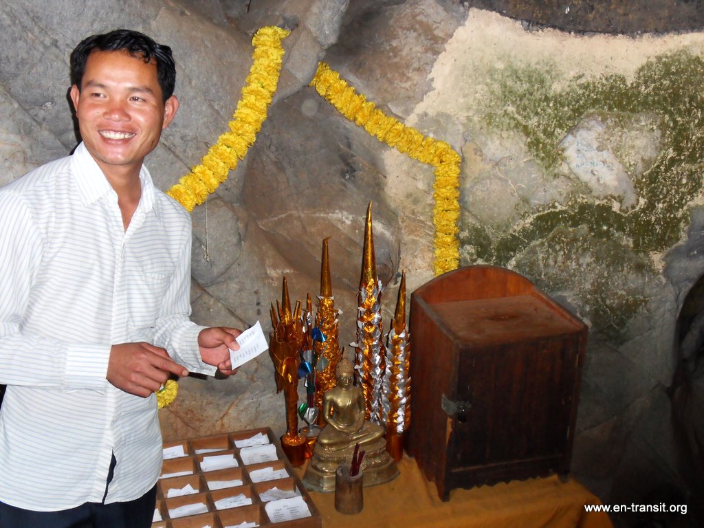 Nous visitons ensuite une grotte qui servait d'hôpital au Pathet Lao lors de la guerre secrète. Les grottes étaient très prisées pour échapper aux bombardements intensifs. Cette grande grotte, ancien temple bouddhiste, accueillait une 50aine de médecins et leur patients. Des milliers de bouteilles de morphine sont là pour l'attester.
