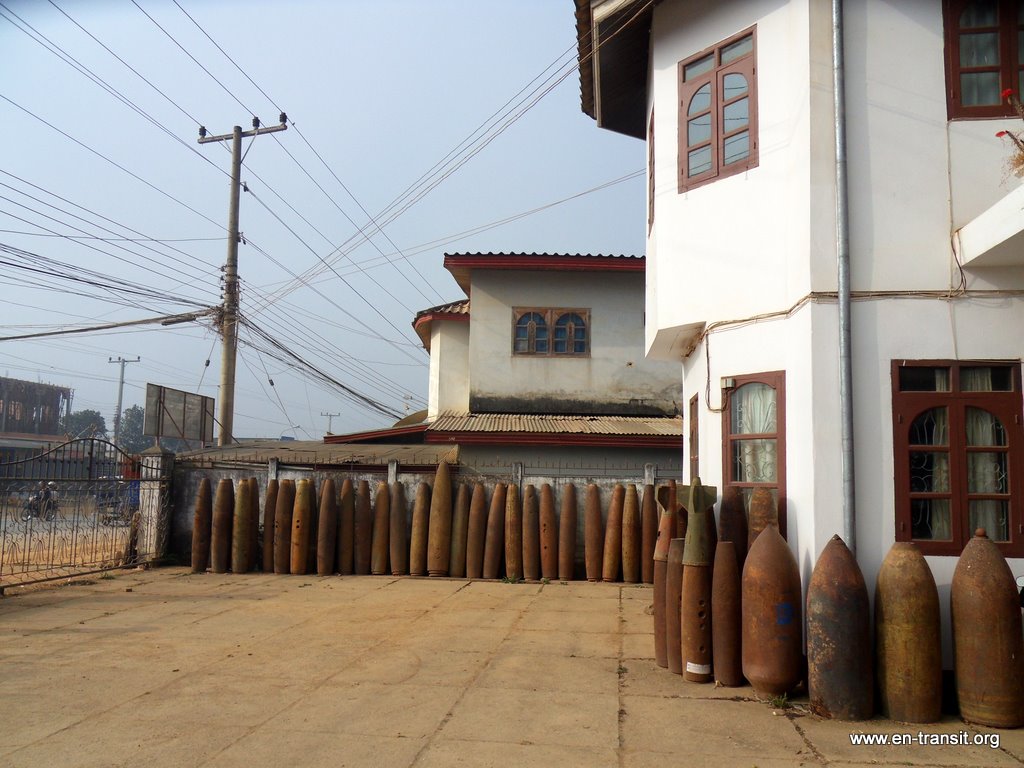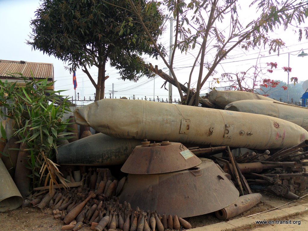- les « cluster-bombs » ou bombes anti-personnel. Ces petites bombes rondes de la taille et du poids d'une boule de pétanque sont disséminées un peu partout. Elles possèdent de petites ailettes qui les font tourner quand elles tombent et explosent après 2000 tours. Du coup, on ne connait pas le nombre de tours qui manquent à celles qui sont sur le sol. La pétanque étant un sport plutôt répandu au Laos (oui, il y a tout de même quelques bienfaits de la colonisation française), les gamins prennent les cluster-bombs pour des jouets...