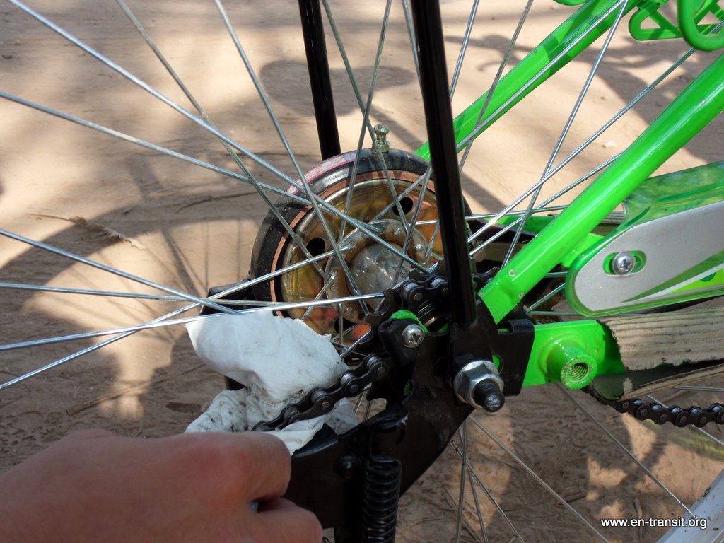 Comme nous essayons de nous instruire de nos erreurs passées, nous louons des vélos qui, à première vue, paraissent nettement mieux (point de VTT, ça fait trop mal aux fesses!). Au bout de 2km, je déraille. ¼ d'heure pour la remettre. Au km n°3, rebelote! Nous faisons appel à un petit réparateur de mobylette pour éviter d'être obligés de rentrer et perdre la journée... Du coup, c'est reparti mon kiki!