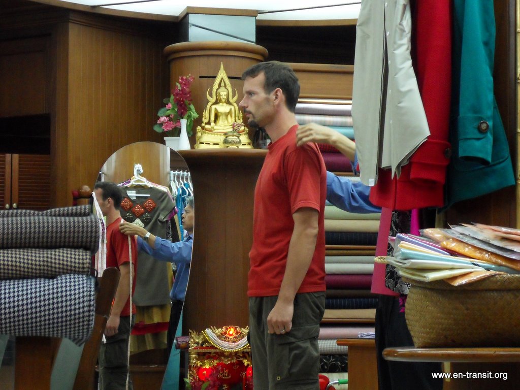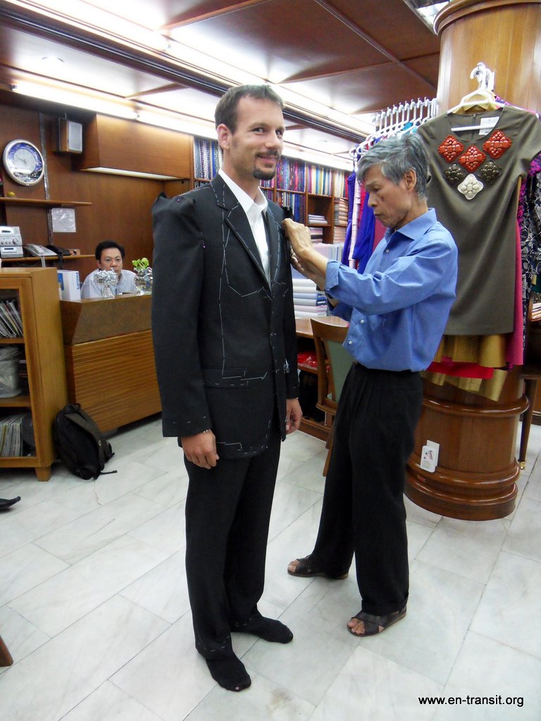 Notre seconde mission est d'ordre vestimentaire. Bangkok est un endroit où il est bon marché de se faire tailler des costards sur mesure. Après s'être renseignés sur les bons quartiers, nous nous lançons dans l'aventure avec Golden Wool qui me confectionne un magnifique costume en à peine 3 jours. Les tailleurs travaillent sur place : un s'occupe du pantalon, un autre de la veste et un troisième de la chemise ! Nous sommes plutôt satisfait du résultat. :)