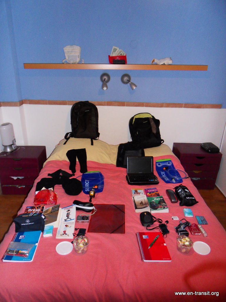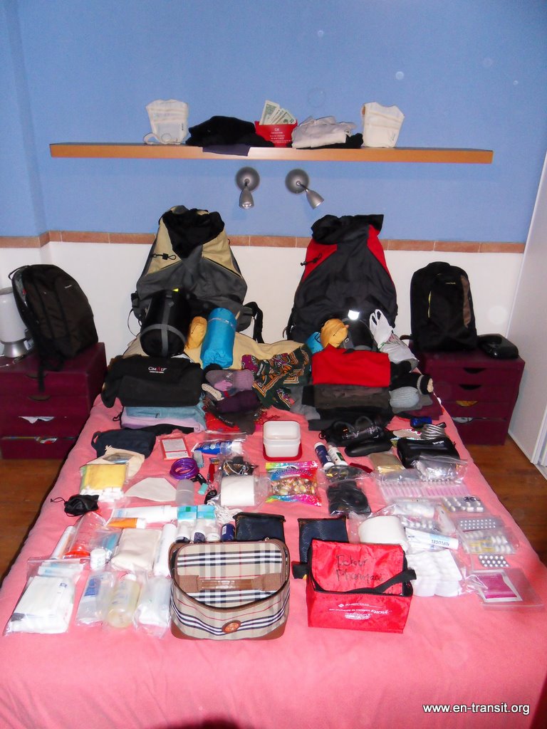 Nous sommes jeudi et c'est férié . Il nous reste quelques semaines avant le départ et nous avons rassemblé 99% de ce que nous emporterons. La mission du jour: faire rentrer tout ça dans les sacs . Nous sommes tous les 2 face au lit sur lequel nous avons étalé tout notre barda. On peut lire l'anxiété sur nos visages. Une goutte de sueur perle sur nos fronts. Le combat s'annonce rude et inégale. Mais bon, quand faut y aller, faut y aller !