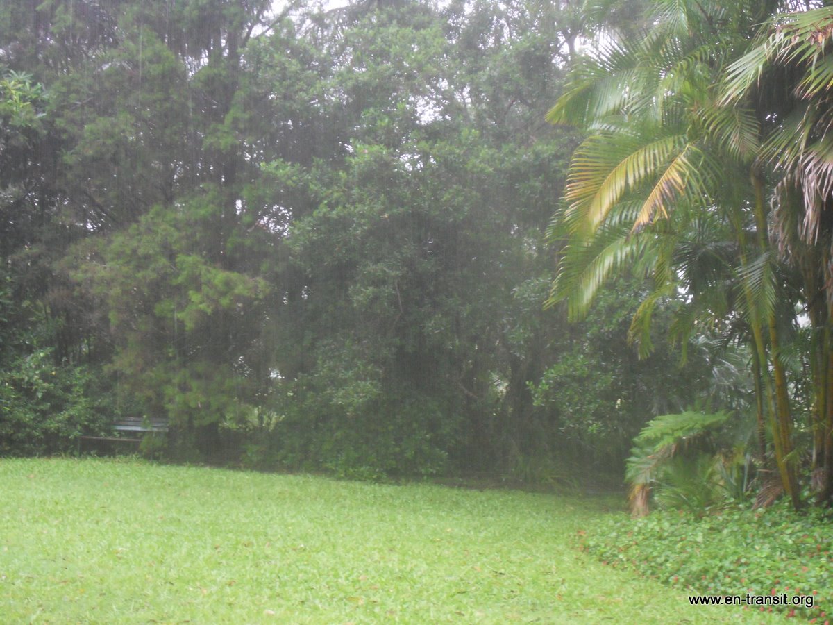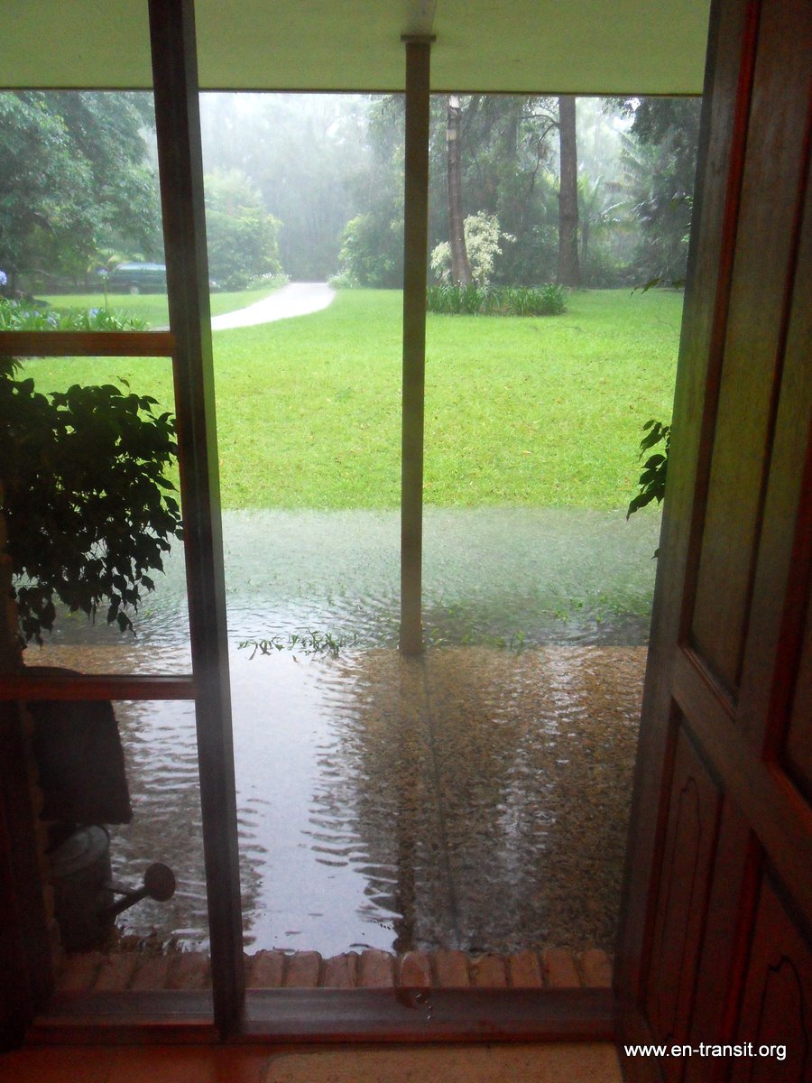 Ici, la pluie est un bruit de fond permanent. Nous sommes dans le Queensland. La région connaît des inondations gigantesques et l'équivalent de la France et l'Allemagne sont sous des mètres d'eau. Nous sommes épargnés, même si par moment, l'eau se rapproche dangereusement du pas de la porte d'entrée.