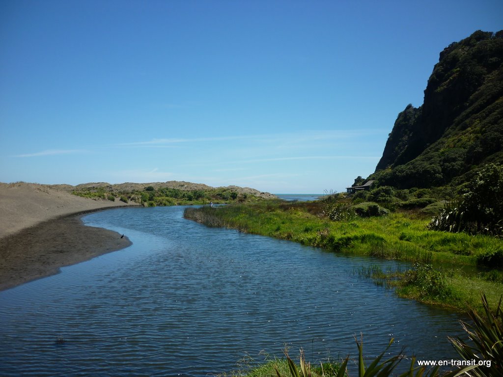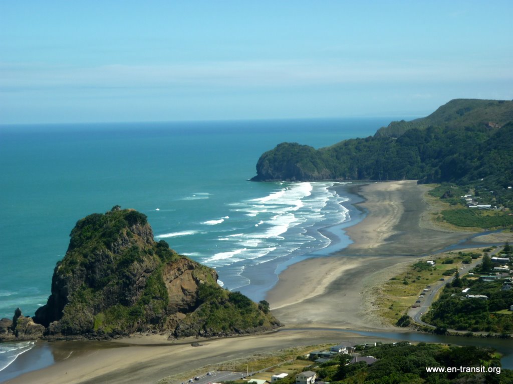 - La magnifique plage de Piha à laquelle nous mène une route tortueuse à travers le bush (forêt) de Waitakere Range.