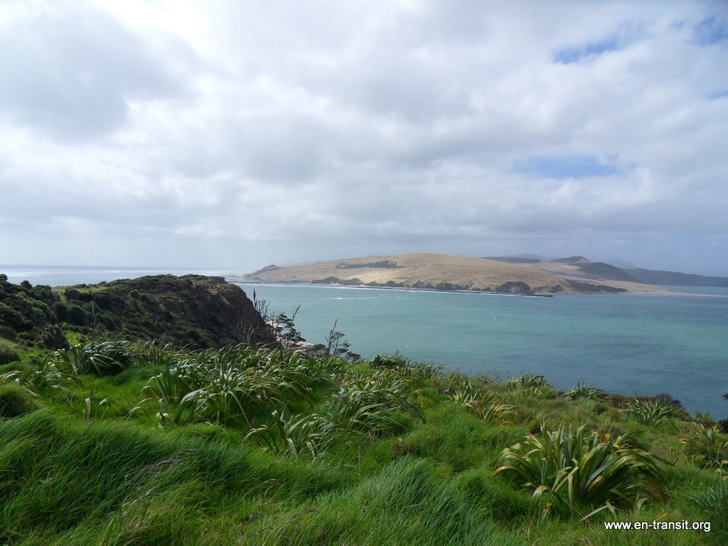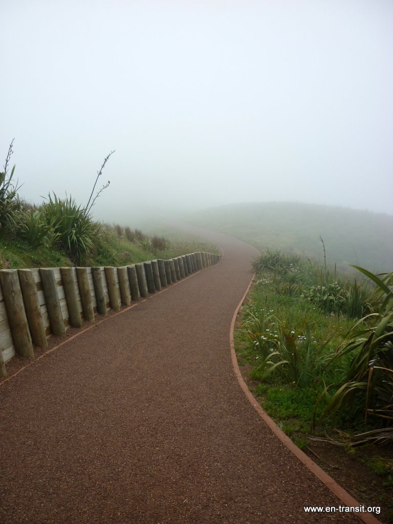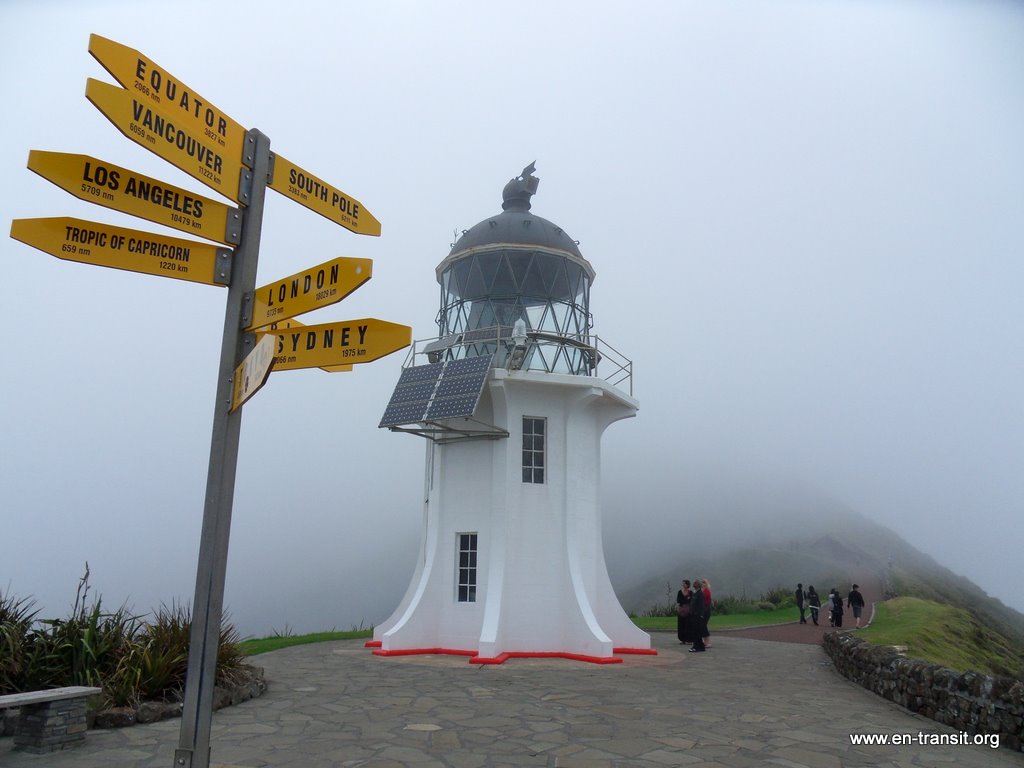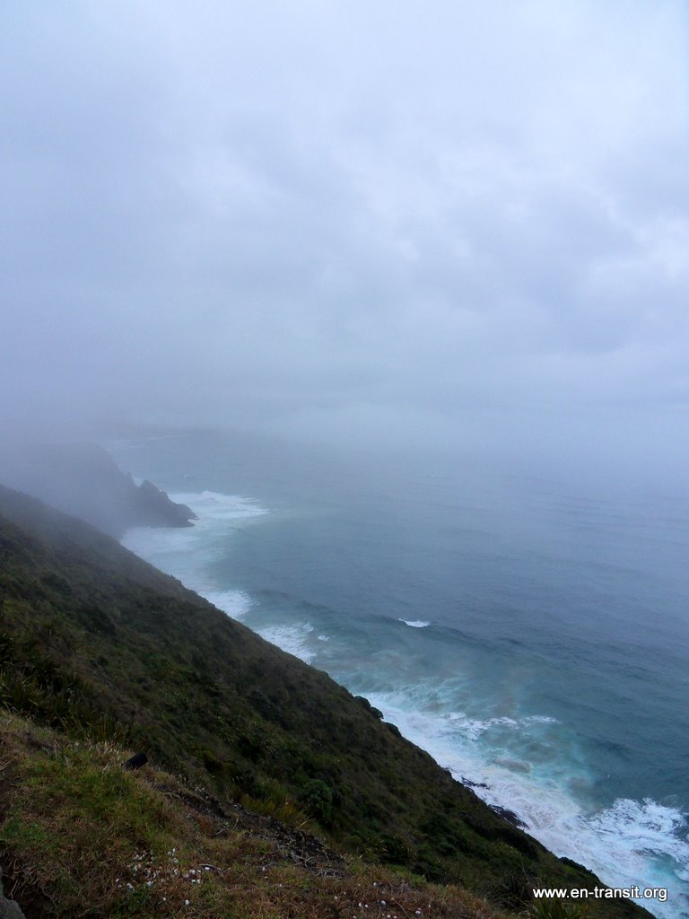 Samedi est encore une journée de route : après un petit-déjeuner copieux en front de mer, nous nous rendons à Cape Reinga, le point le plus au nord de la Nouvelle-Zélande, là où se rencontrent l'océan Pacifique et la mer de Tasmanie. Whaaaa ! On peut y voir la ligne de démarcation... si le temps est dégagé ! Ce n'est pas le cas pour nous : le brouillard pourrait se couper au couteau, on y voit pas à 50m. Cela dit, le phare dans le brouillard, c'est inoubliable... surtout après 2h30 du bagnole ! :/ Soirée vin, fromage, pain grillé, pop-corn et papotage au camping.