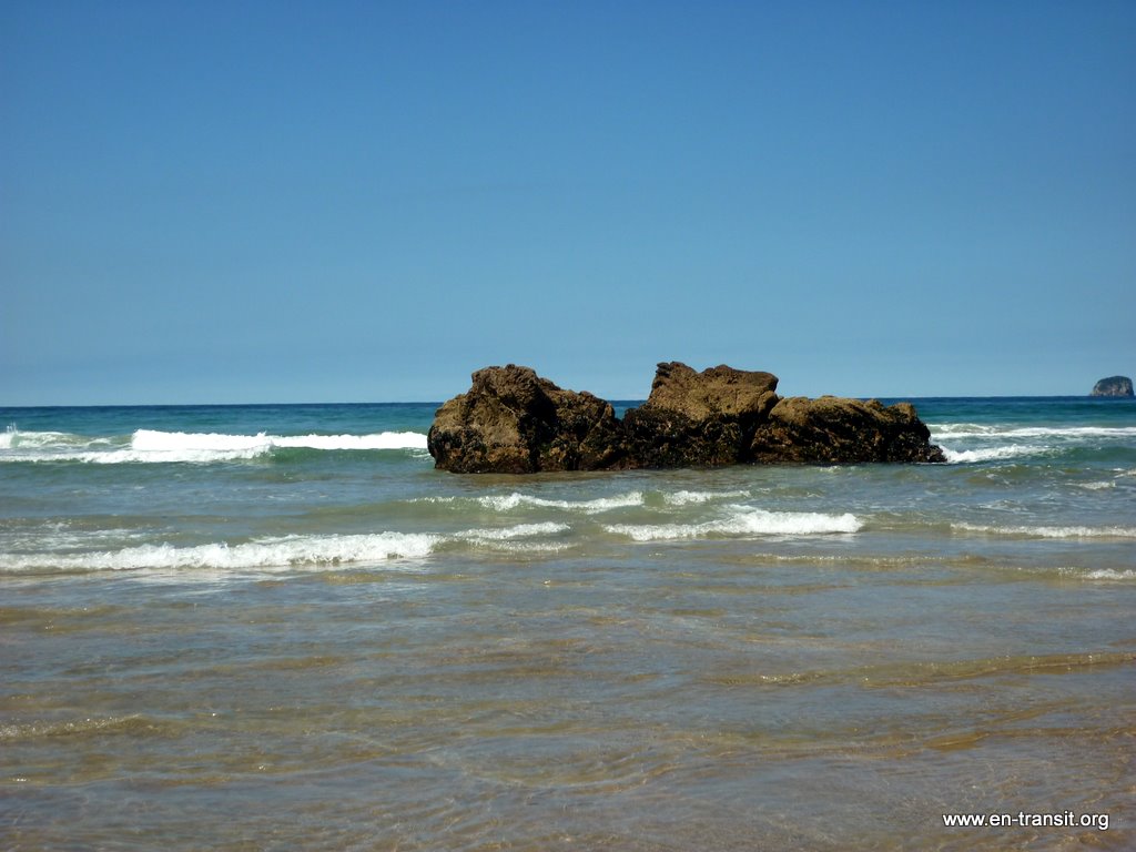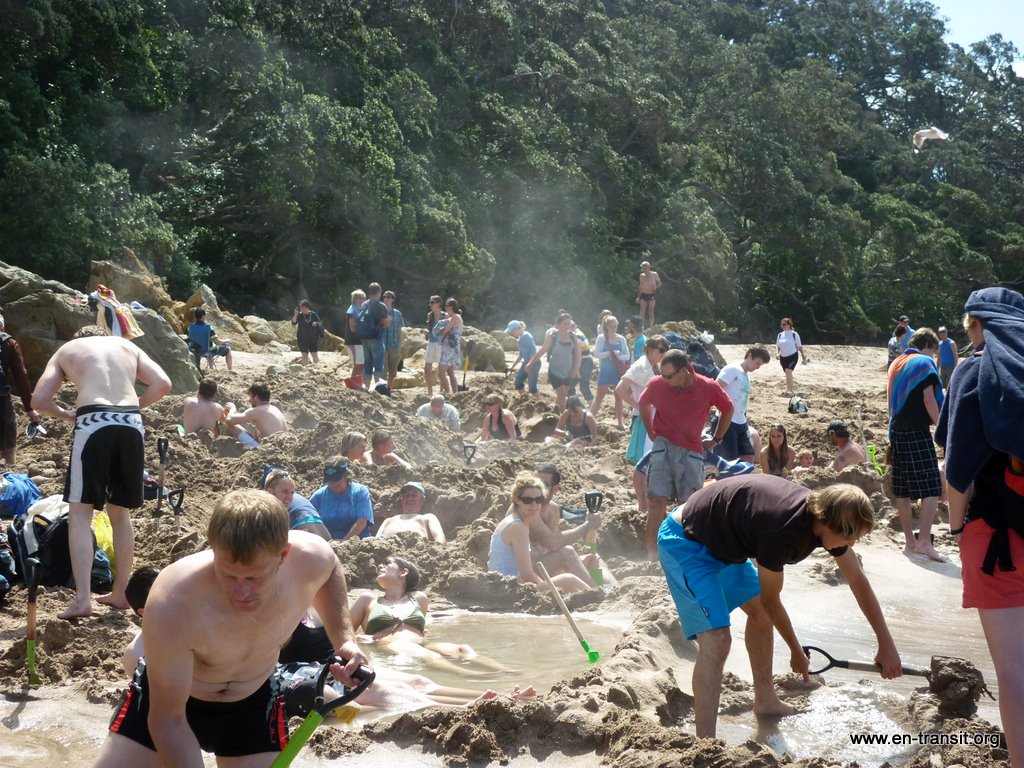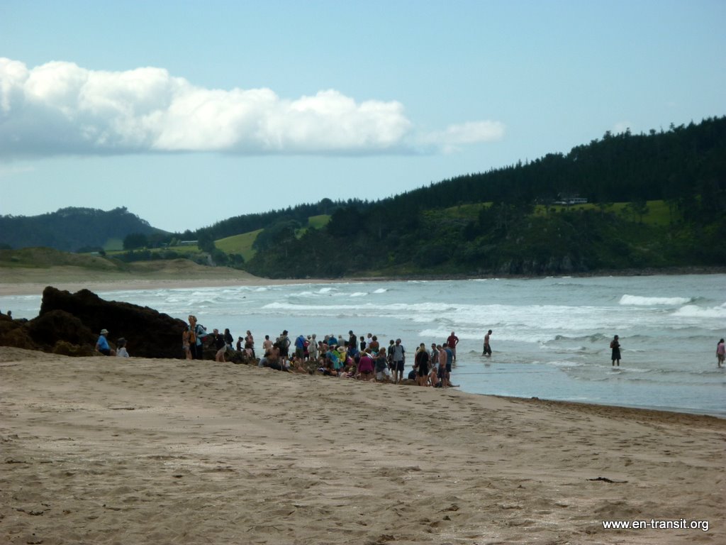 Le lendemain, il a fait un temps superbe et, c'est balo, nous avons passé une bonne partie de la journée à équiper notre van : une table et des chaises pliantes, un chargeur de PC à brancher sur l'allume-cigare, un cordon pour écouter les MP3 sur la radio (parce que c'est difficile de capter de la musique). Puis, nous avons pris la direction de la côte est de la péninsule, près de Whenuakite, où se trouve Hot Water Beach (littéralement, plage d'eau chaude) où nous pensions nous baigner. Car ici, de l'eau à 60°C sort du sable et avec celle de l'océan, ça donne une eau tempérée. C'est assez surprenant de voir chacun s'affairer pour creuser sa piscine personnelle pour profiter des sources d'eau chaude. Il y a une plage immense mais les gens ne sont concentrés que sur une bande d'une vingtaine de mètres. Nous pensions faire les coucous et piquer un trou abandonné, mais nous n'en avons pas trouvé avec de l'eau tiède... Du coup, nous avons fait une micro sieste en observant les fourmis, avant de reprendre la route.