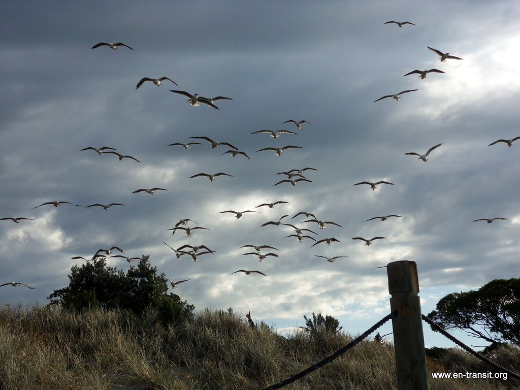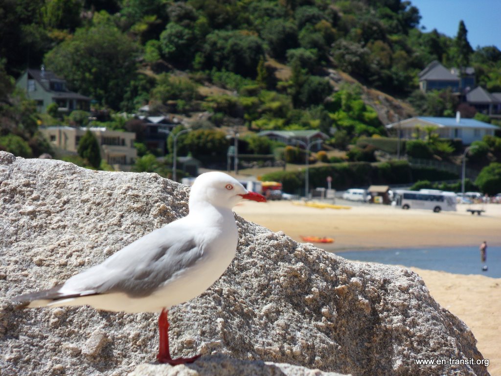 Pas une seule de repos depuis ¾ d'heure alors qu'il y en a partout. La loi de Murphy est encore d'actualité. Nous posons notre van dans un camping de sémillants troisièmagistes, à Richmond, à côté de Nelson, refaisons une sieste puis un petit tour à la plage : les mouettes sont menaçantes!