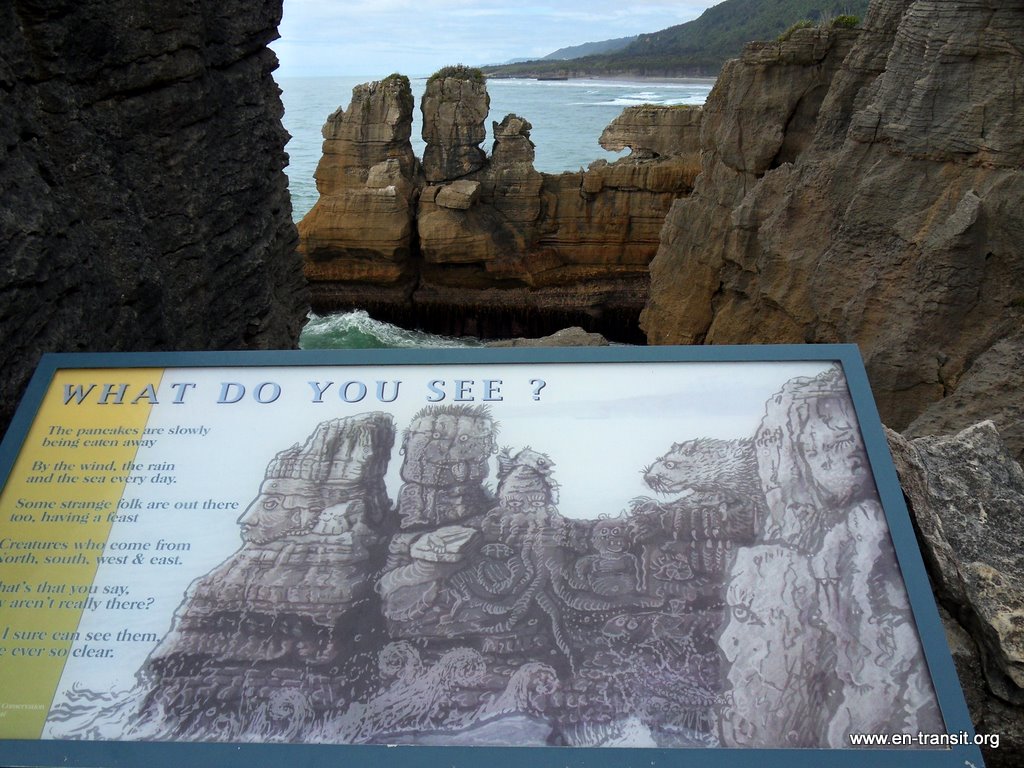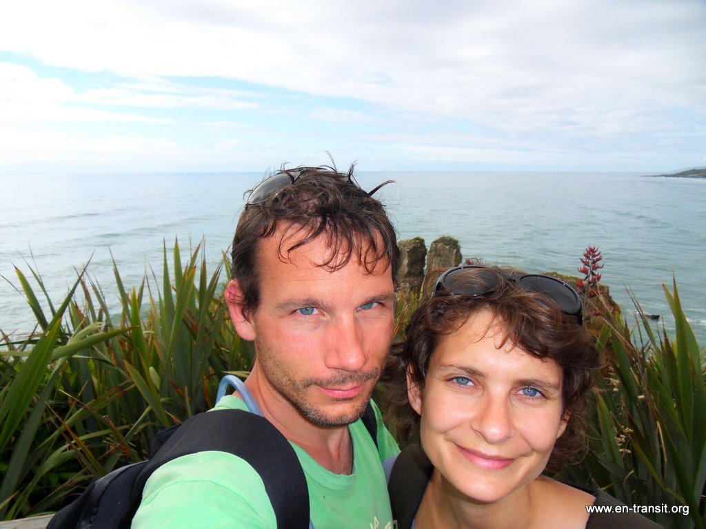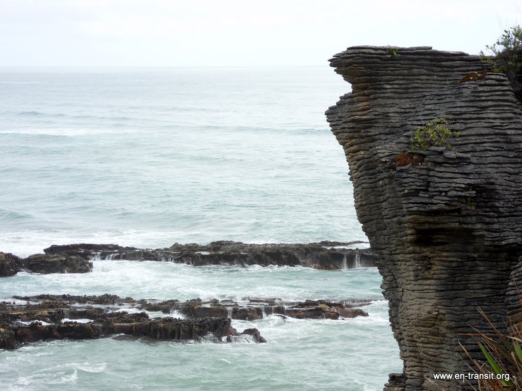 Nous descendons voir à Punakaiki, les « Pancakes Rocks », une formation géologique qui donne envie de manger quelques tranches du paysage... Nous sommes en pleine marée basse et nous ne verrons donc pas les impressionnants souffleurs, trous où l'eau s'engouffre et ressort avec force comme un geyser.